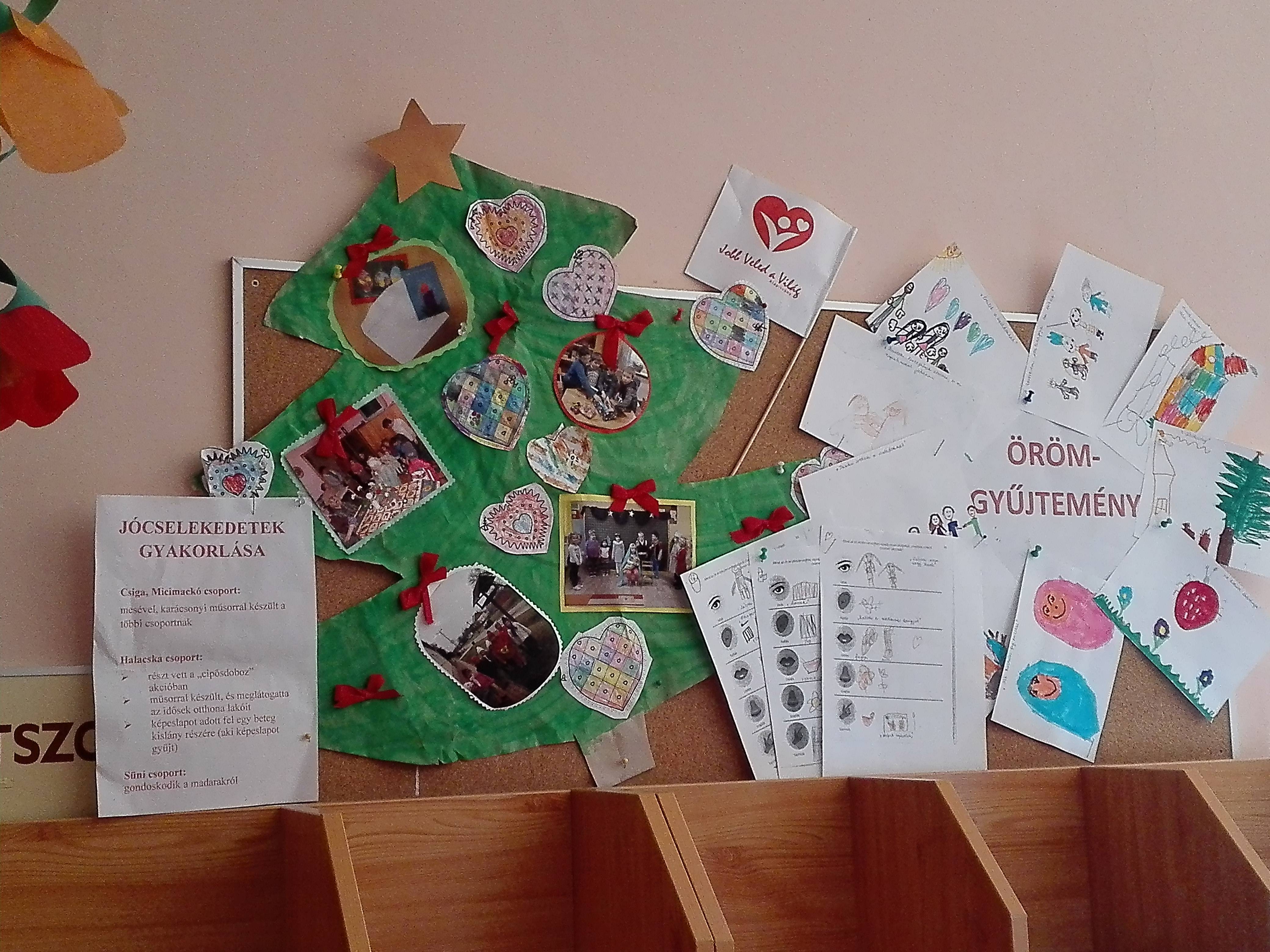 A „Faliújság” készítése közben a gyerekekkel felidéztük, hogy az ismét előkerült munkák készítése közben mit éreztek, mire emlékeznek a feldolgozott témákból. Munkáikat az óvodában olyan helyre tettük, ahol mindenki jól láthatja, a csoportok külön- külön is megnézték kis „tárlatunkat”.