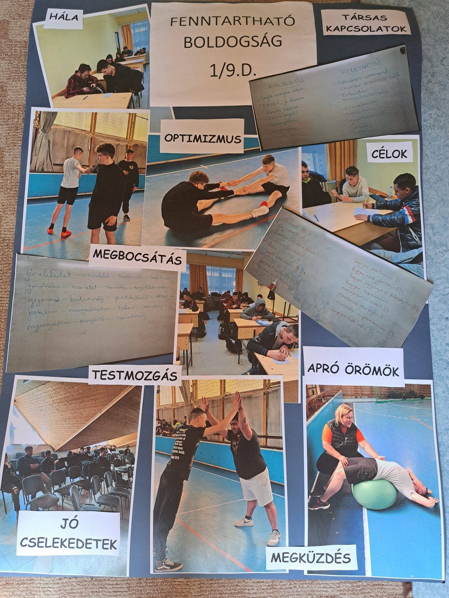 A tanév utolsó hónapjában a fenntartható boldogsággal foglalkoztunk az 1/9.D. osztály tanulóival. Átbeszéltük a tanévben feldolgozott témákat, és hogy a tanultakat ki és hogyan tudja alkalmazni, beépíteni az életébe, a mindennapjaiba, mennyire váltak szokássá a tanultak. Az osztály tanulói elkezdték alkalmazni a tanultakat, az elvégzett feladatokra és témákra nagyon jól emlékeztek.