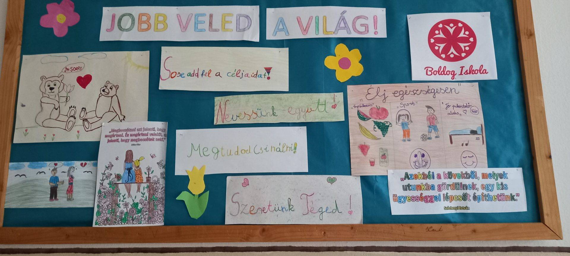 A gyerekekkel összegyűjtöttük a boldogságórákon készült munkákat. Azok az alkotásk kerültek fel a faliújságra, amely számukra a legjobban tetszett.