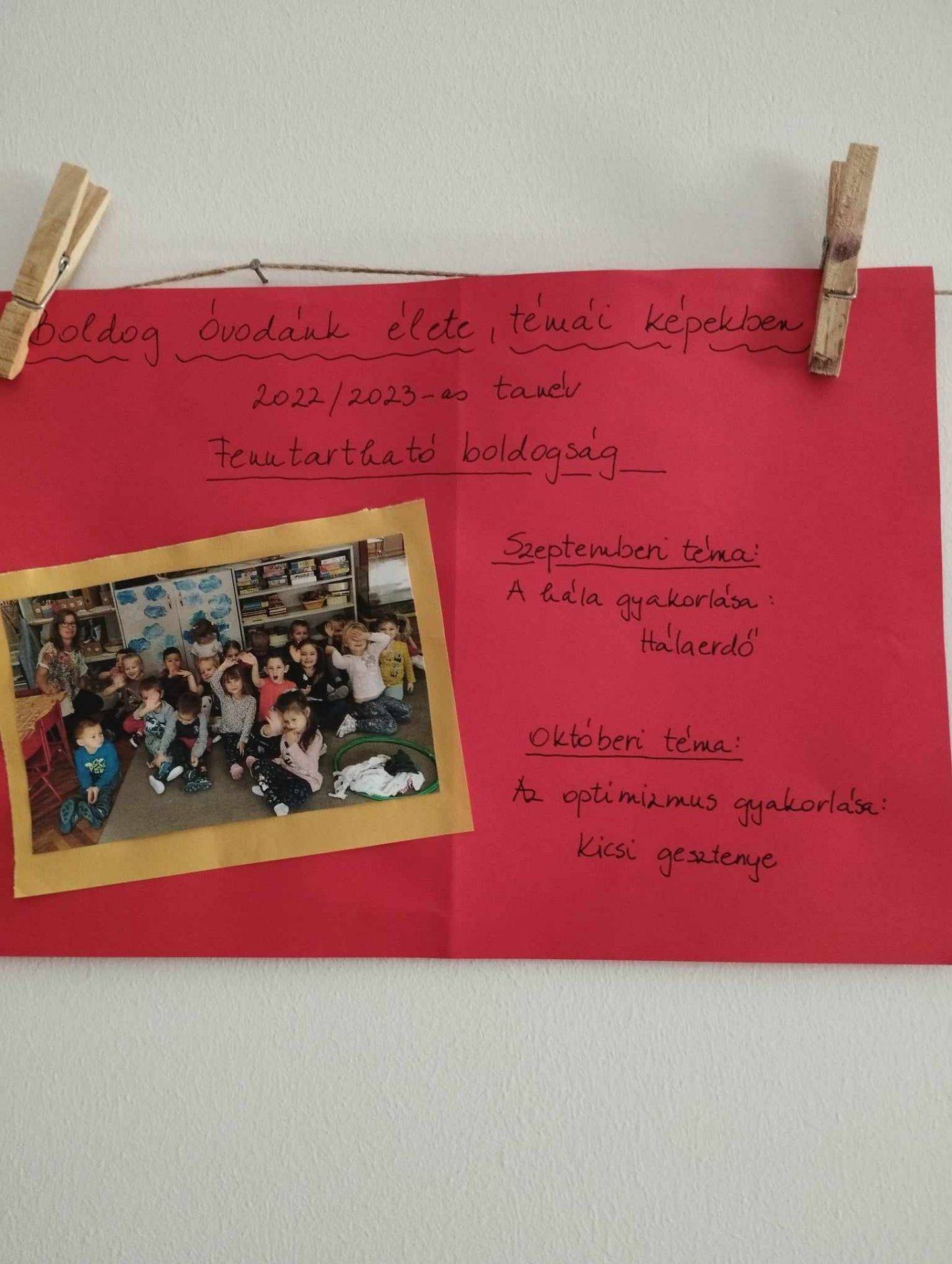 Óvodánkban a folyosón létesítettünk egy boldogságfalat, ahol a gyerekek legnagyobb örömére ki-ki felismerhette magát egy-egy képen. Az intézményünkbe látogató felnőttek is bepillantást nyerhettek óvodánk boldog pillanataiba, egész éves boldog munkánkba. Örömet szerezünk ezzel felnőttnek és gyereknek egyaránt.