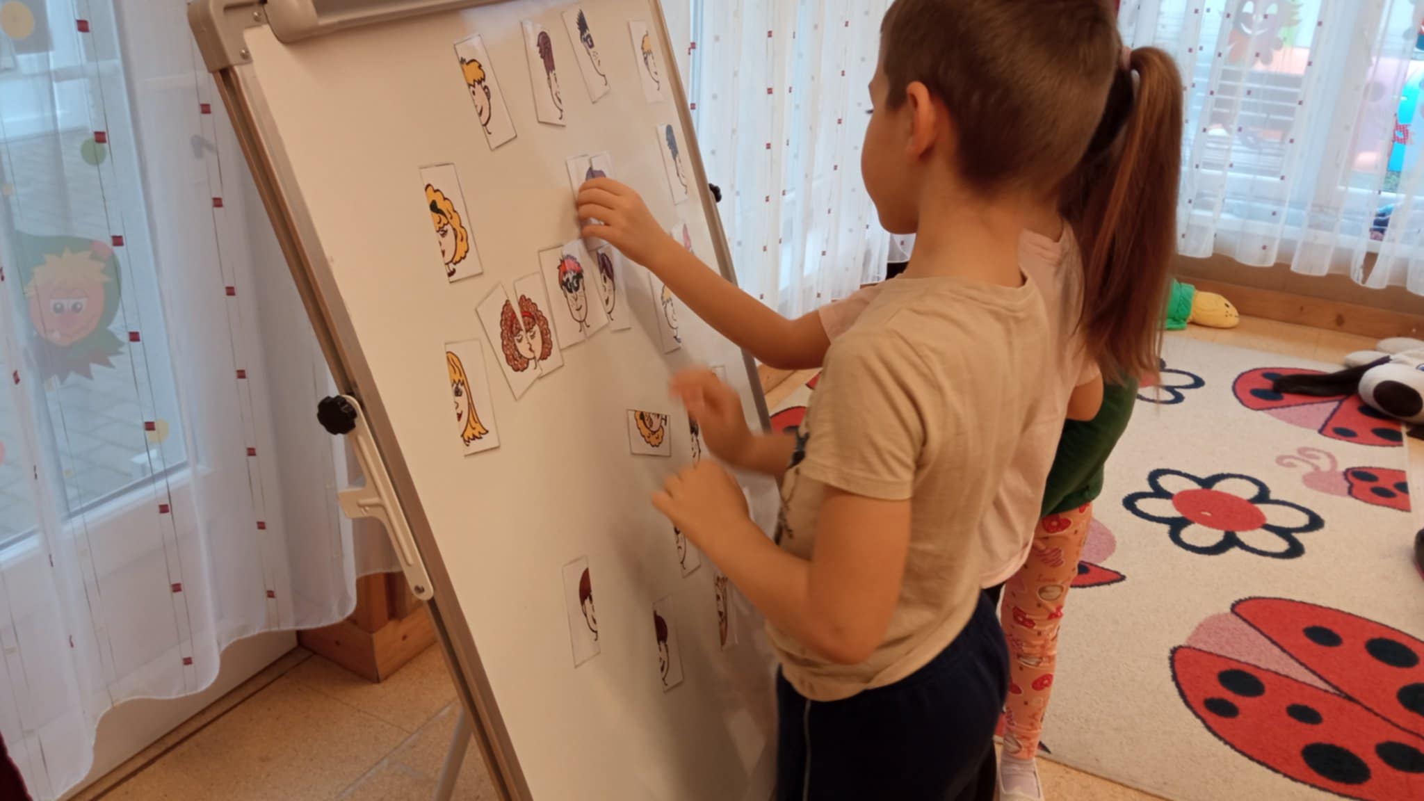 A megküzdés témakörének feldolgozását a belső egyensúly megteremtésével és közös relaxációval indítottuk. Az „Együtt a hangokban…” című gyakorlatot választottam, melynek során a magasabb regiszterektől a mélyebbek felé haladva végeztünk intonációs játékot. A gyerekek harmonikusan kapcsolódtak be a folyamatba, melynek végén gyönyörűen zengett a közös hangjuk. A beszélgetést tudatosan arra irányítottam, hogy ha bármilyen frusztráció vagy stressz ér bennünket, azt pozitív gondolkodással és tudatos megküzdési stratégiákkal kezelhetjük. Az „Ellazulni jaj, de jó” című dal nyújtott kiváló hátteret, amellyel a csoportban már többször gyakorolt feszítés-lazítás technikáját mélyítettük el. Az érzelemfelismerés segítésére mágnestáblára helyezett, nagyított arckifejezéseket használtunk, melyek segítségével a gyerekek magabiztosan azonosították a metakommunikációs jelzéseket. Ezt követően szituációs játékokat végeztünk: különböző konfliktushelyzeteket vázoltam fel, melyekre közösen kerestünk konstruktív megoldásokat. A megküzdést egy izgalmas bátorságpróbával is modelleztük: a gyerekek kedvenc társasjátékait „raboltam el”, melyeket különböző próbák teljesítésével válthattak ki. A téma feldolgozása során központi szerepet kapott a „Pillanatkapitány” meséje, melynek során eljutottunk az „Ötök szigetére”. Itt a beszélgetés fonala az érzékszerveink köré fonódott: átvettük, hogyan és miként tapasztalunk a világban. Igen mély, érzékenyítő beszélgetést kezdeményeztem arról, hogy a különböző érzékszervek hiánya hogyan hat az emberre. Közösen eljátszottuk, milyen érzés, ha nem látunk, nem tudunk beszélni, nem hallunk, vagy nem tudunk tapintani. A szituációs gyakorlatok során a gyerekeket mélyen érintette a felismerés, hogy a fogyatékossággal élőknek milyen kihívásokkal kell megküzdeniük. Ez a tapasztalás láthatóan és mélyen hatott az empátiájuk fejlődésére. A játékot kognitív rendszerezés követte: képeket csoportosítottunk az érzékszervekhez, majd egy családi képsorozaton keresztül azonosítottuk és utánoztuk az arc mimikáját és az érzelmeket. A foglalkozássorozatot „Az arany kulcs” című mese kísérte végig. Bár a történet hosszú volt, az érzelemgazdag és szemléletes előadásmód, valamint a farsangi készülődés jegyében felöltött jelmezek segítettek a gyerekeknek azonosulni a szereplőkkel és átélni a királylány személyiségfejlődését. A mese utáni alkotótevékenység során a gyerekek részletgazdagon színeztek, majd önarcképet készítettek, melyen megfigyelték saját arcvonásaikat és aktuális érzelmi állapotukat. Pedagógiai hitvallásom, hogy nincs „rossz” vagy agresszív gyermek; minden viselkedésnek oka van, és mindenki egy csodálatos, egyéni utat igénylő személyiség. Célom a csoportban egy olyan bizalmi légkör kialakítása, ahol a gyerekek nemcsak egyénileg küzdenek meg a nehézségeikkel, hanem észreveszik egymás szomorúságát is, vigasztalják egymást, és pozitívan viszonyulnak társaikhoz. A foglalkozást a megküzdés jelének elkészítésével, a boldogságlépcsőre való felhelyezésével és a „Boldog vagyok” című közös dallal zártuk le.
