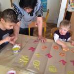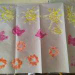 Az óvodásokkal egy séta alkalmával érzékeltük érzékszerveinkkel a tavaszi színeket és illatokat a virágok által, a napfény melegét és a lágy szellő érintését a bőrünk által. Visszaérkezve az óvodába megörökítettük a tavaszi apró örömeinket, újra átéltük élményeinket.(Napfény melege, pillangók tánca, virágok illata). Szivacsnyomdával napocskát, pillangót és virágot festettünk szép tavaszi színeket használva.