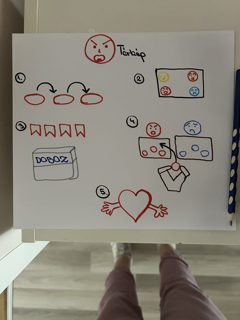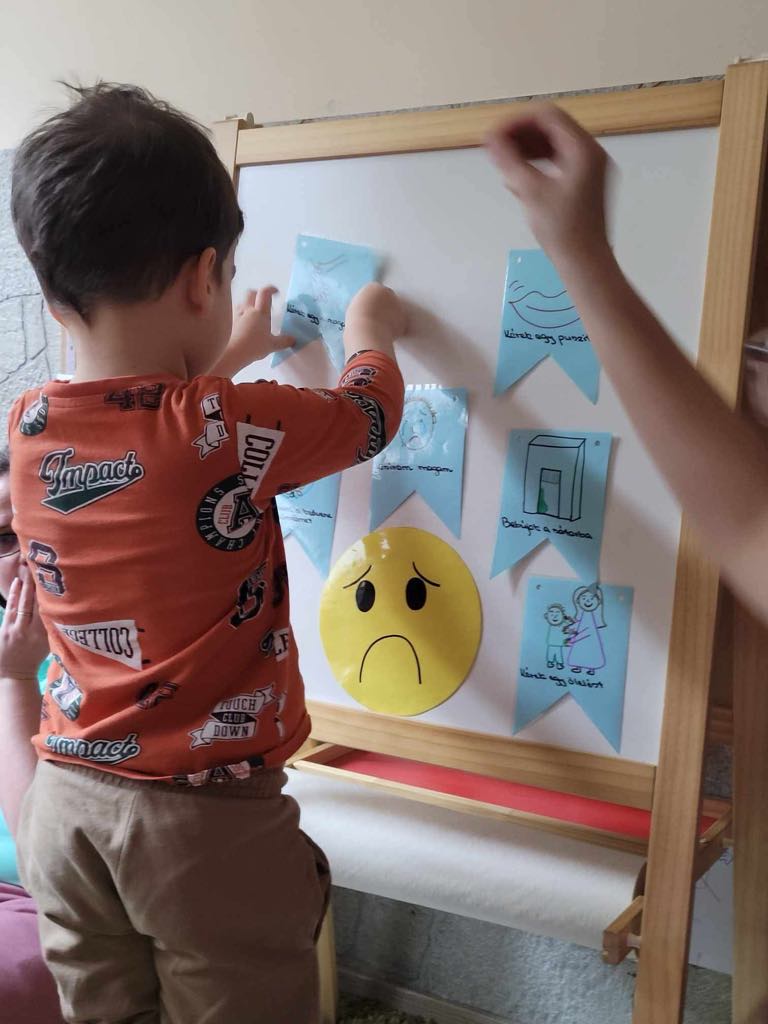 Minden érzelem és állapot kapcsán először elkülönítettük az adott érzelmeket, majd sorra vettük, hogy milyen megoldási stratégiák állnak a rendelkezésünkre, hogy boldoggá varázsoljuk magunkat. Ezeket a témákat egy úgynevezett érzelmi útjelzőn helyzetük el, mely fix helyet kapott a csoportban. Így is lehetőséget adva arra, hogy a gyermekek felnőtt segítséggel, vagy maguktól, vagy egymást segítve tudjanak jó megoldást találni az érzelmeik kezelésére.