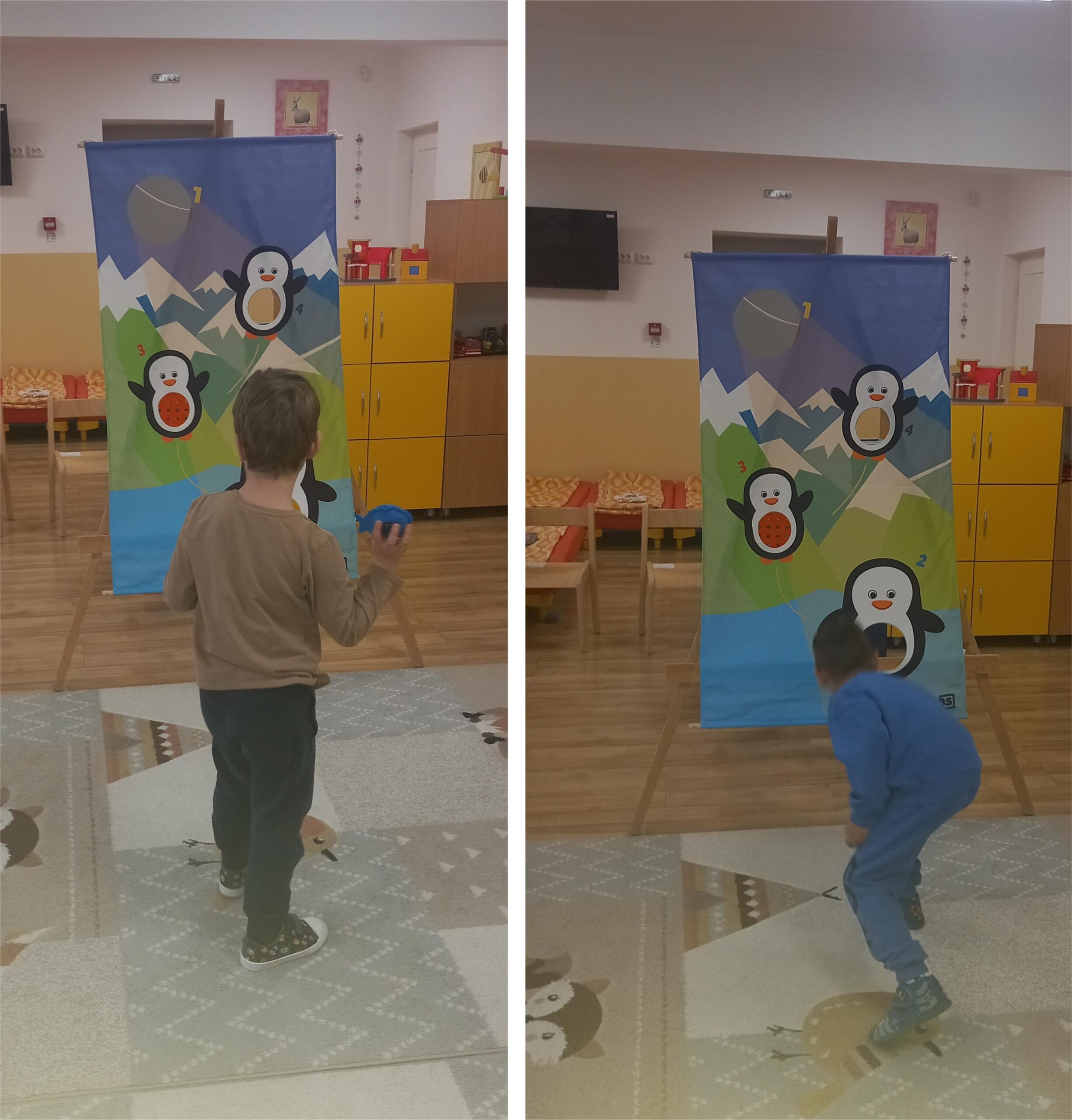 A gyerekek lelkesen próbálkoztak, és minden sikeres dobást nagy öröm kísért. Amikor betaláltak a pingvin hasába, mosolyogtak, örültek, és büszkék voltak magukra.