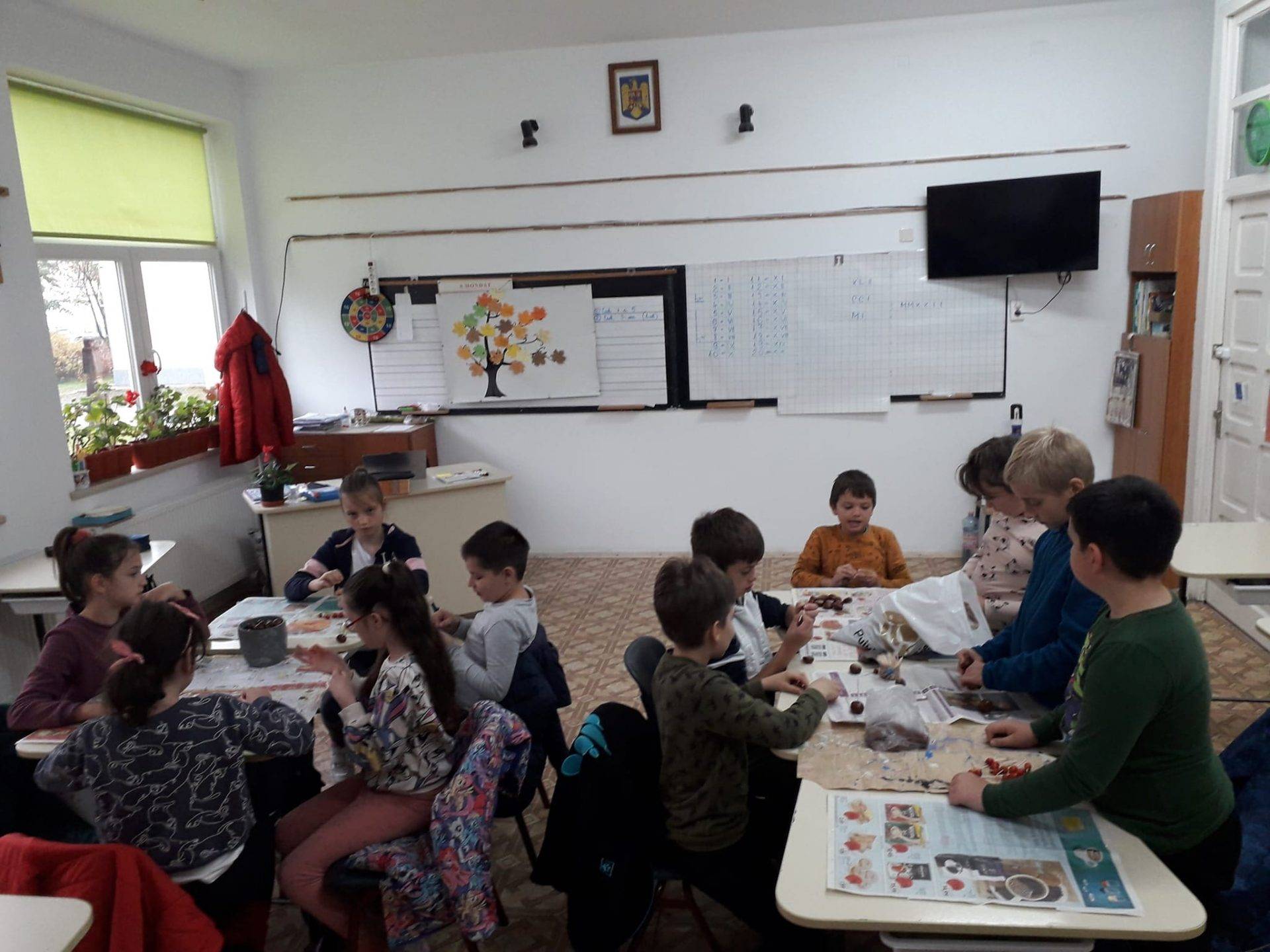 A gyűjtögetett gesztenyékből csapatmunkában alkottak. Egyik csapat egy teljes strandot készített, körhintával, fagyiárussal. A másik csapat egy kis állatkertet, emlősökkel, madarakkal. A munkákat az iskolai őszi kiállításban mutattuk meg.
