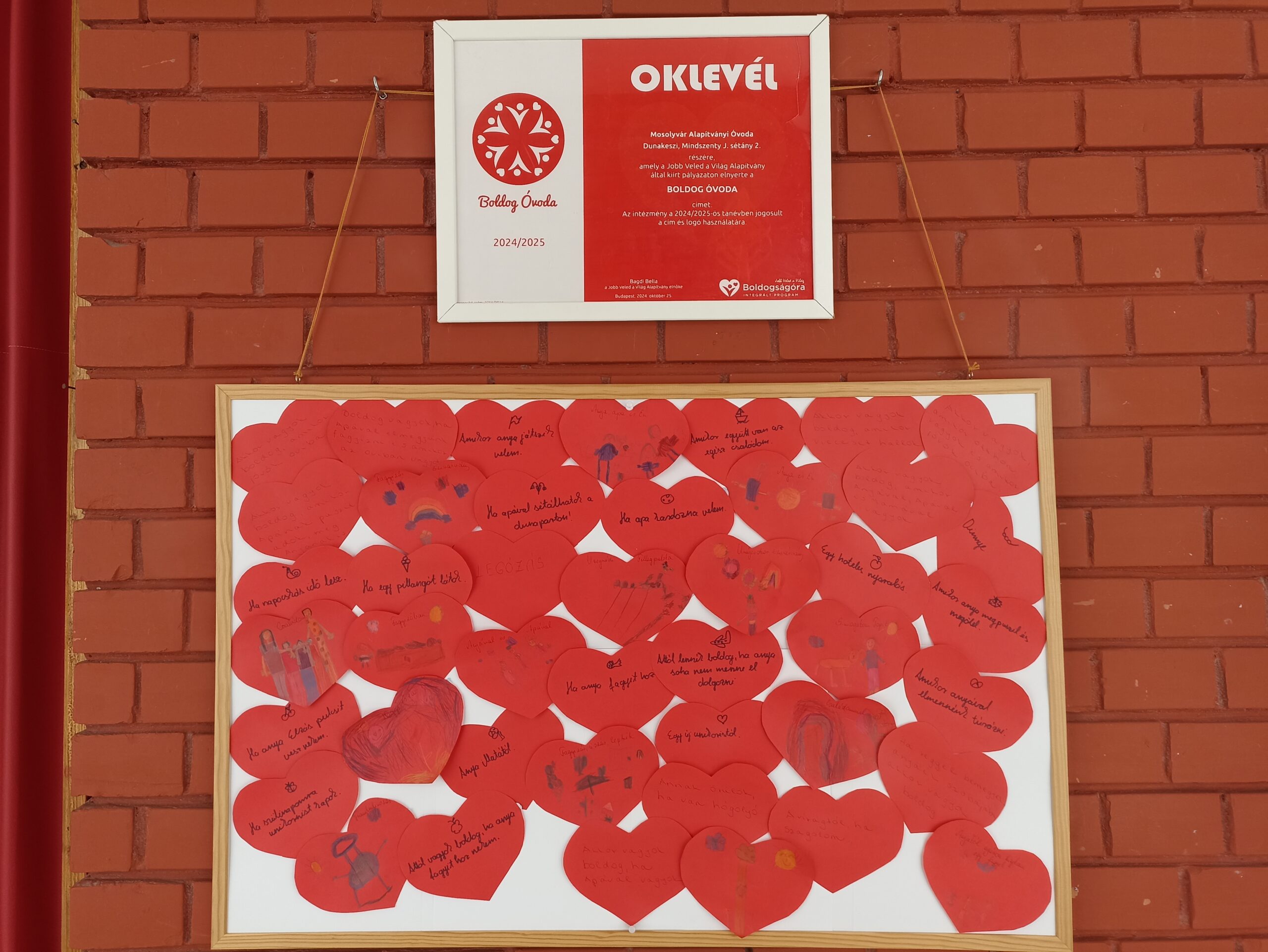 Az év egyik különleges eseménye volt a Boldogság Világnapja, amikor az egész óvoda-gyerekek, és felnőttek együtt- összegyűlt. Ezen a napon mindenki megölelte a másikat, ezzel is kifejezve a szeretetet, és az összetartozást. Készítettünk egy nagy, közös fali képet piros szívekből: a nagyobbak rárajzolták, mi okoz nekik boldogságot, a kisebbek pedig szóban megfogalmazták, amit én írtam rá a szívekre. Az elkészült művet az óvoda folyosóján állítottam ki, hogy a szülők is láthassák.