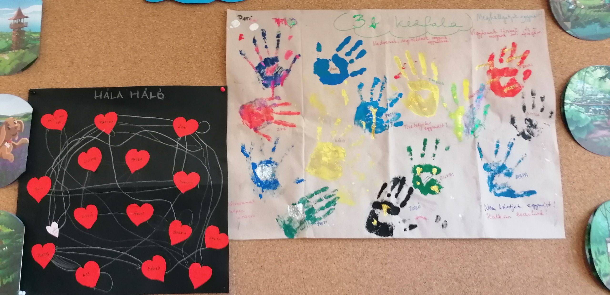 A szeptembert kézfallal és a szabályok lefektetésével kezdtük. Hála hálót készítettünk, először nem értették, miért fontos hálát érezni valami, valaki iránt, többen mondták poénból, hogy csak maguknak hálásak. Időközben ahogy haladtunk előre téma feldolgozásában egyre inkább gyarapodtak az összekötő vonalak (fonalak) a szívecskék között, még olyan gyerekek között is, akiknek azelőtt nem volt kapcsolatuk egymással. Hálakupont készítettek, melyekért hálásak voltak a szülők, tanárok egyaránt.