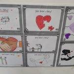 A gyerekeknek el kellett képzelniük egy diákot, aki valamiért nehéz időszakon megy keresztül, vagy mostanában nehéz sora van. Lehet, hogy nehezen talál barátokat, vagy nem sikerül olyan jó jegyeket szereznie, amilyeneket szeretne, vagy sokat veszekszik a testvérével. Beszélgettünk arról, még milyen nehézségei lehetnek. Ezután mindenki készített egy képeslapot, a megadott sablonnal, amit az elképzelt személynek szeretett volna ajándékozni, jelezve ezzel, hogy mellette van a nehézségekben. A feladattal azt kívántam hangsúlyozni, hogy mindenkinek jól esik tudni, hogy nincs egyedül, és néha egy kis, szeretetteljes gesztus is segíthet széppé tenni a napot.