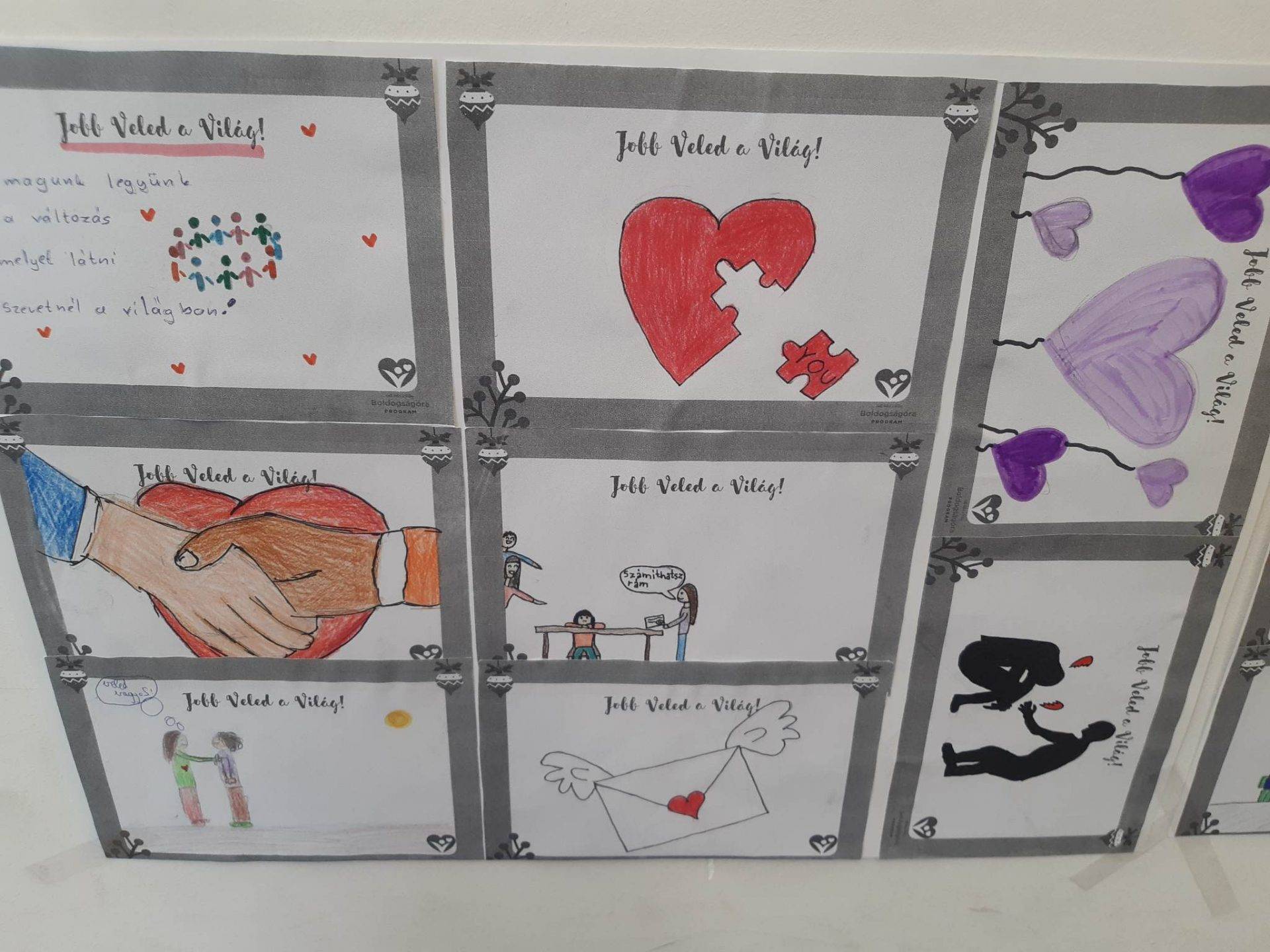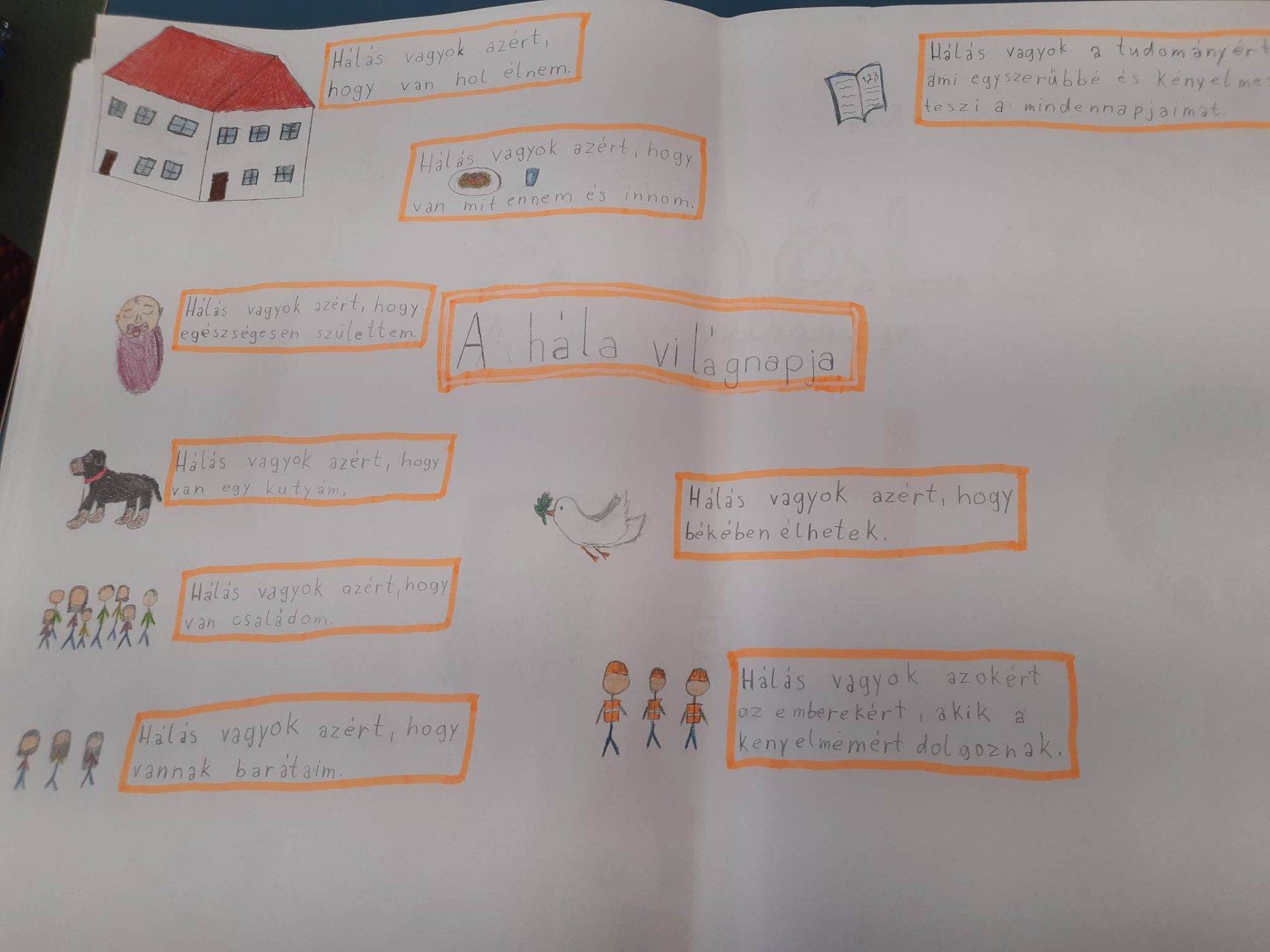 A hála világnapja alkalmából, a gyerekek lerajzolták az általuk választott technikával és megnevezték, hogy mikor és miért éreztetek hálát az adott időszakban. A rajzokon változatos dolgok szerepeltek. Volt, aki pl. hálás volt azért, mert lehetett egy kutyája. Volt olyan tanuló is, aki a családjáért, a családjával együtt töltött időért volt hálás. Volt, aki azért volt hálás, mert elmondása szerint békében élhet. Egy tanuló azért érzett hálát, mert egészségesen született, rajzban fejezte ki ezt. Volt, aki a barátaiért fejezett ki hálát, illetve azokért az emberekért, akik a kényelméért dolgoznak. Olyan tanuló is volt, aki a hálával kapcsolatosan idézeteket gyűjtött.