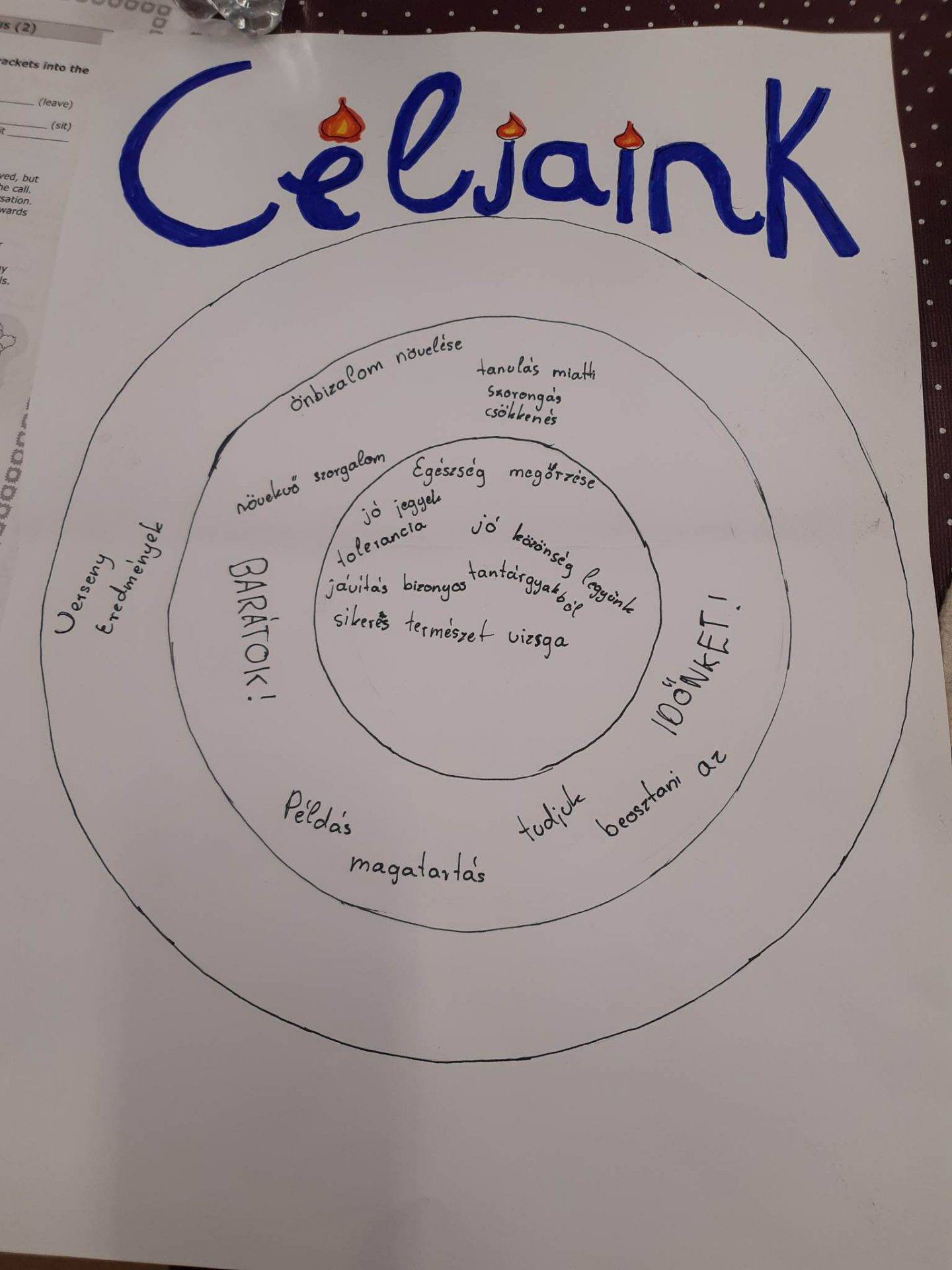 Januárban a célok részletes tanulmányozása után a feladat az volt, hogy a gyerekek készítsenek közösen egy nagy céltáblát. A céltábla egy szabályos kör alakú, jellemzően lapos felület. ami 6 körgyűrűből állt. Kijelöltünk egy osztálycélt a hónap vagy a hét végéig, amin az osztály közös erővel szándékozott igyekezni, az került a céltábla közepébe. Ezt a nagy célt kisebb részcélokra bontottuk, és azokat ütemezési sorrendben, a felület körgyűrűiben kívülről befelé haladva írtuk fel, úgy, hogy a legkülső körgyűrűbe a leghamarabb megvalósítandó részcél került. Időzítést is rendeltünk a részcélokhoz, milyen határidővel szeretnénk megvalósítani őket.
