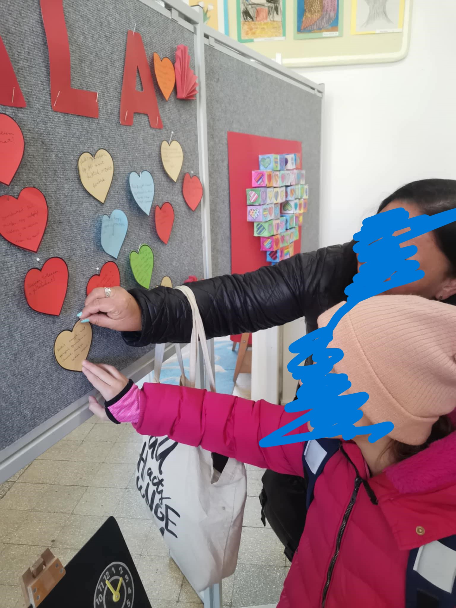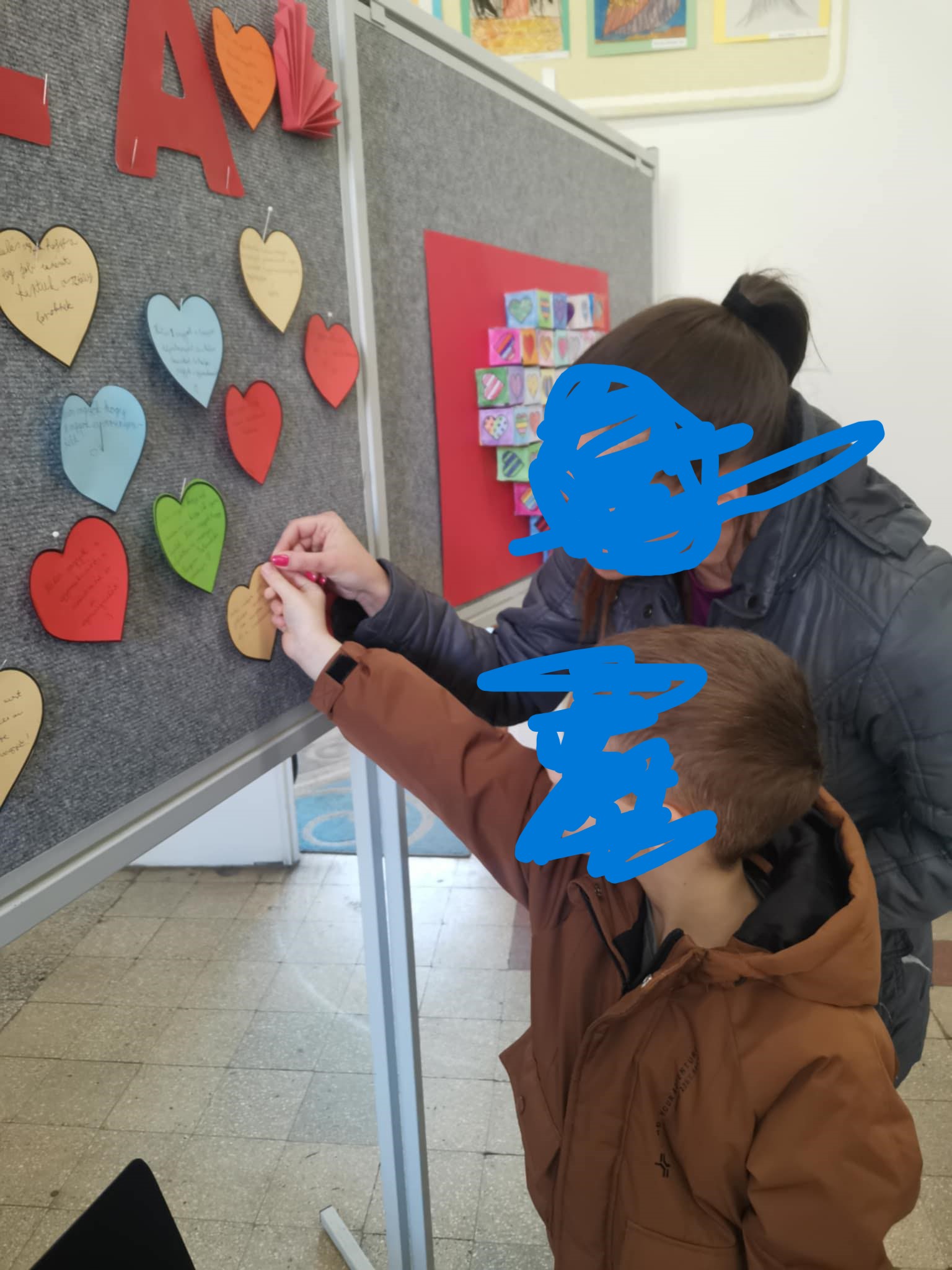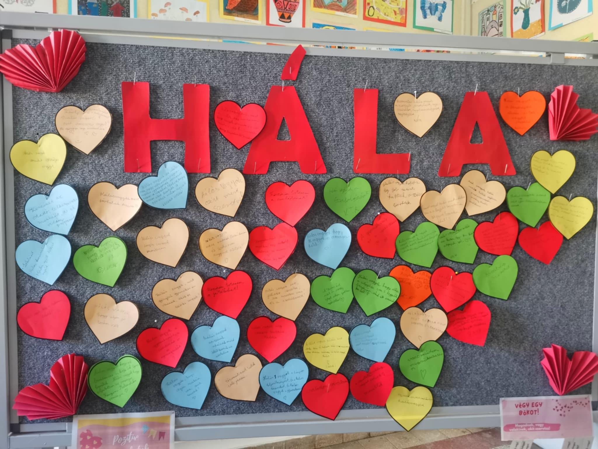 Új elemként merült fel az ötlet, hogy ne csak mi „menjünk ki” a faluba, hanem a szülőket is vonjuk be az ünneplésbe, csábítsuk be őket az iskolába. Ennek jegyében a tanulókkal együtt Boldogságnapi faliújságot készítettünk, melynek központi eleme egy Hálafal volt. A szülők, pedagógusok és gyerekek egyaránt írhattak színes papírszívecskékre rövid gondolatokat arról, hogy miért éreznek hálát az életükben. A szívecskéket a folyosó paravánjára tűztük ki, és hetekig olvastuk meghatódva a szeretetteljes, elgondolkodtató, őszinte üzeneteket.