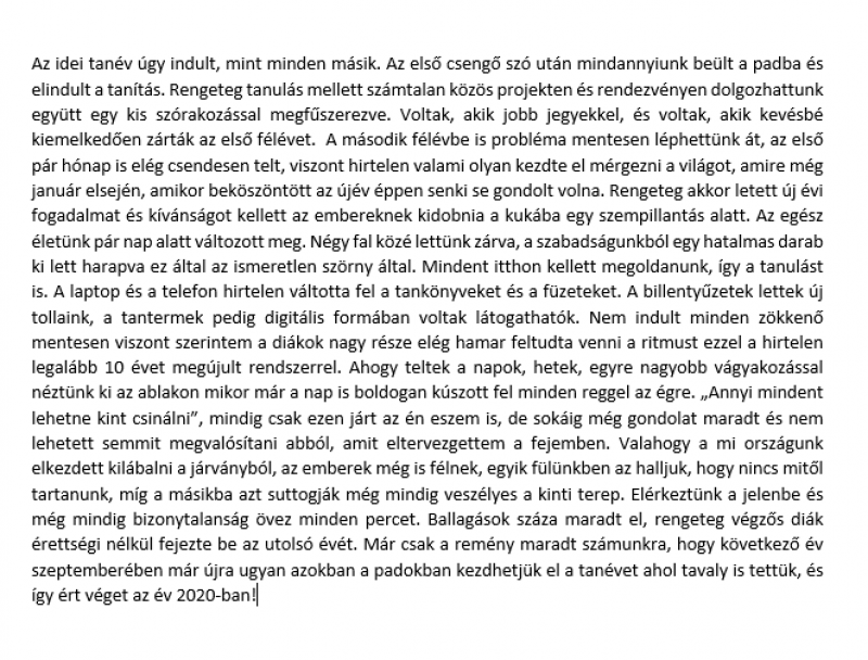 Az idei tanév úgy indult, mint minden másik. Az első csengő szó után mindannyiunk beült a padba és elindult a tanítás. Rengeteg tanulás mellett számtalan közös projekten és rendezvényen dolgozhattunk együtt egy kis szórakozással megfűszerezve. Voltak, akik jobb jegyekkel, és voltak, akik kevésbé kiemelkedően zárták az első félévet. A második félévbe is probléma mentesen léphettünk át, az első pár hónap is elég csendesen telt, viszont hirtelen valami olyan kezdte el mérgezni a világot, amire még január elsején, amikor beköszöntött az újév éppen senki se gondolt volna. Rengeteg akkor letett új évi fogadalmat és kívánságot kellett az embereknek kidobnia a kukába egy szempillantás alatt. Az egész életünk pár nap alatt változott meg. Négy fal közé lettünk zárva, a szabadságunkból egy hatalmas darab ki lett harapva ez által az ismeretlen szörny által. Mindent itthon kellett megoldanunk, így a tanulást is. A laptop és a telefon hirtelen váltotta fel a tankönyveket és a füzeteket. A billentyűzetek lettek új tollaink, a tantermek pedig digitális formában voltak látogathatók. Nem indult minden zökkenő mentesen viszont szerintem a diákok nagy része elég hamar feltudta venni a ritmust ezzel a hirtelen legalább 10 évet megújult rendszerrel. Ahogy teltek a napok, hetek, egyre nagyobb vágyakozással néztünk ki az ablakon mikor már a nap is boldogan kúszott fel minden reggel az égre. „Annyi mindent lehetne kint csinálni”, mindig csak ezen járt az én eszem is, de sokáig még gondolat maradt és nem lehetett semmit megvalósítani abból, amit eltervezgettem a fejemben. Valahogy a mi országunk elkezdett kilábalni a járványból, az emberek még is félnek, egyik fülünkben az halljuk, hogy nincs mitől tartanunk, míg a másikba azt suttogják még mindig veszélyes a kinti terep. Elérkeztünk a jelenbe és még mindig bizonytalanság övez minden percet. Ballagások száza maradt el, rengeteg végzős diák érettségi nélkül fejezte be az utolsó évét. Már csak a remény maradt számunkra, hogy következő év szeptemberében már újra ugyan azokban a padokban kezdhetjük el a tanévet ahol tavaly is tettük, és így ért véget az év 2020-ban!