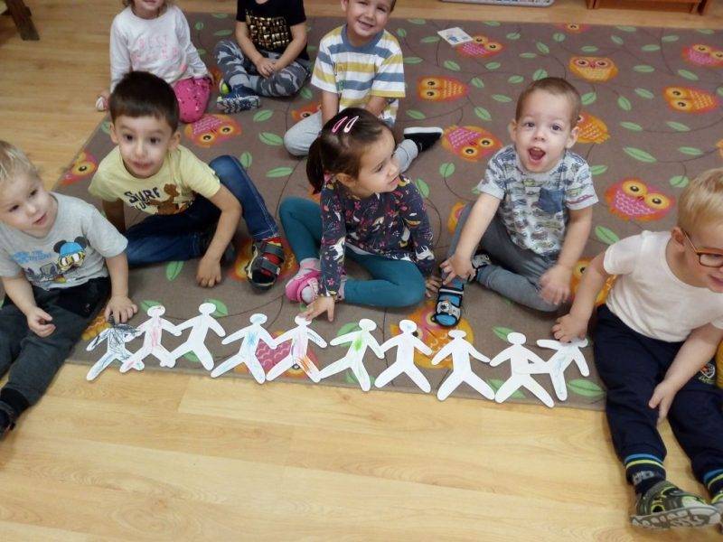 A figyelmük eddig volt ebben a helyzetben tartható. Motiválásként embert ábrázoló papírfigurákat színeztek. Ezek voltak ők maguk. Majd egymás mellé téve alkottunk egy boldog, együtt táncoló csoportot. 🙂