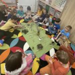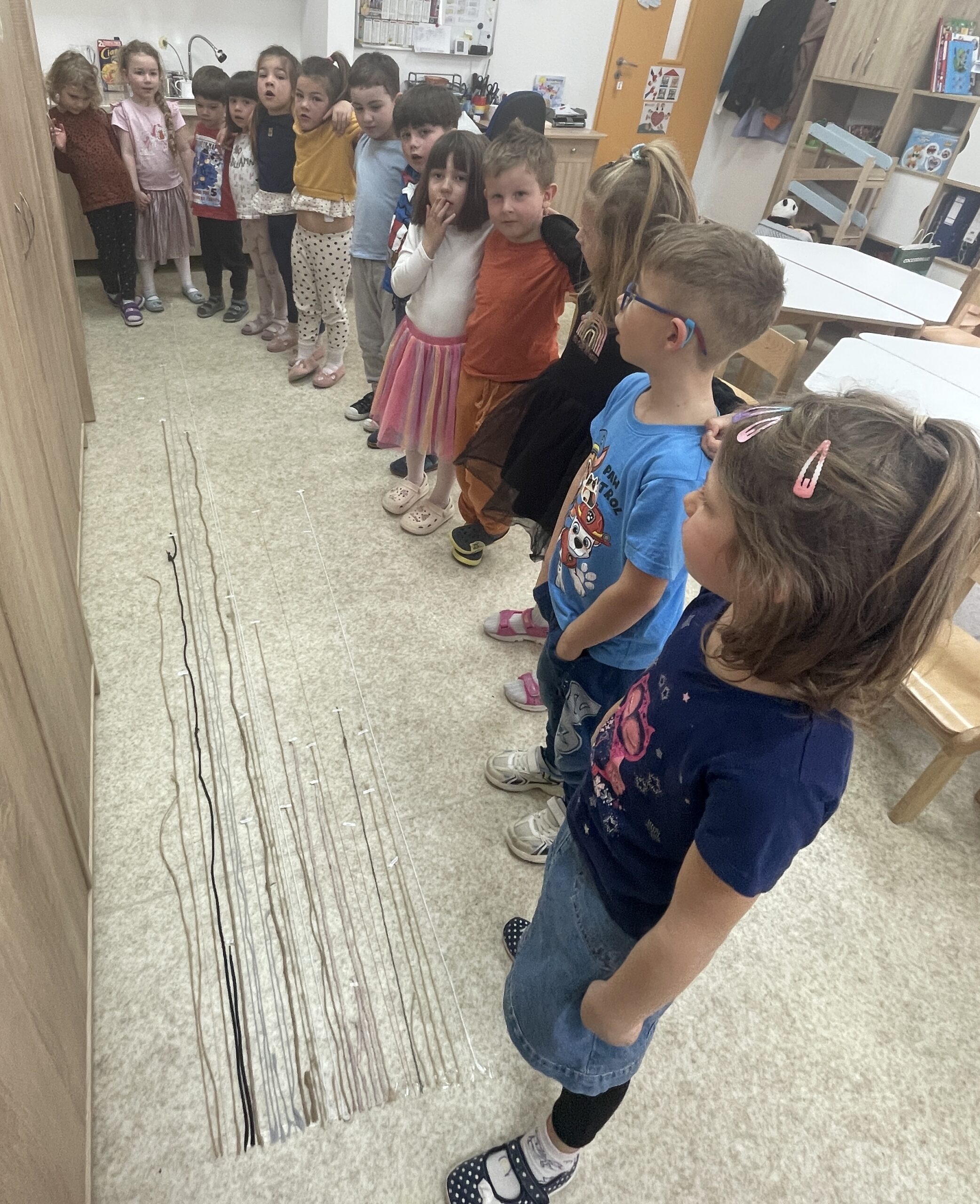 A környezetükben lévő legvastagabb és legvékonyabb törzsű fáról méretet hoztak zsineggel. Majd összemértük a terem padlóján. Ez lett a “Mi erdőnk!”