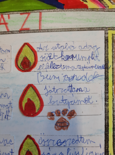 Elkészítettük a Szent Márton napi jócselekedetek lámpásait is: a gyerekek apró lángocskákra írták fel azokat a jócselekedeteket, amiket napjaik során végrehajtottak. Ezeket a lángokat ragasztották fel a lámpásukra, ezáltal láthatóvá vált, milyen fényt gyújtottak jóságukkal.