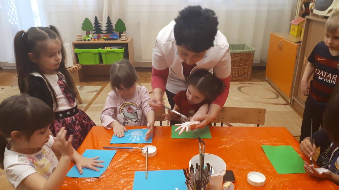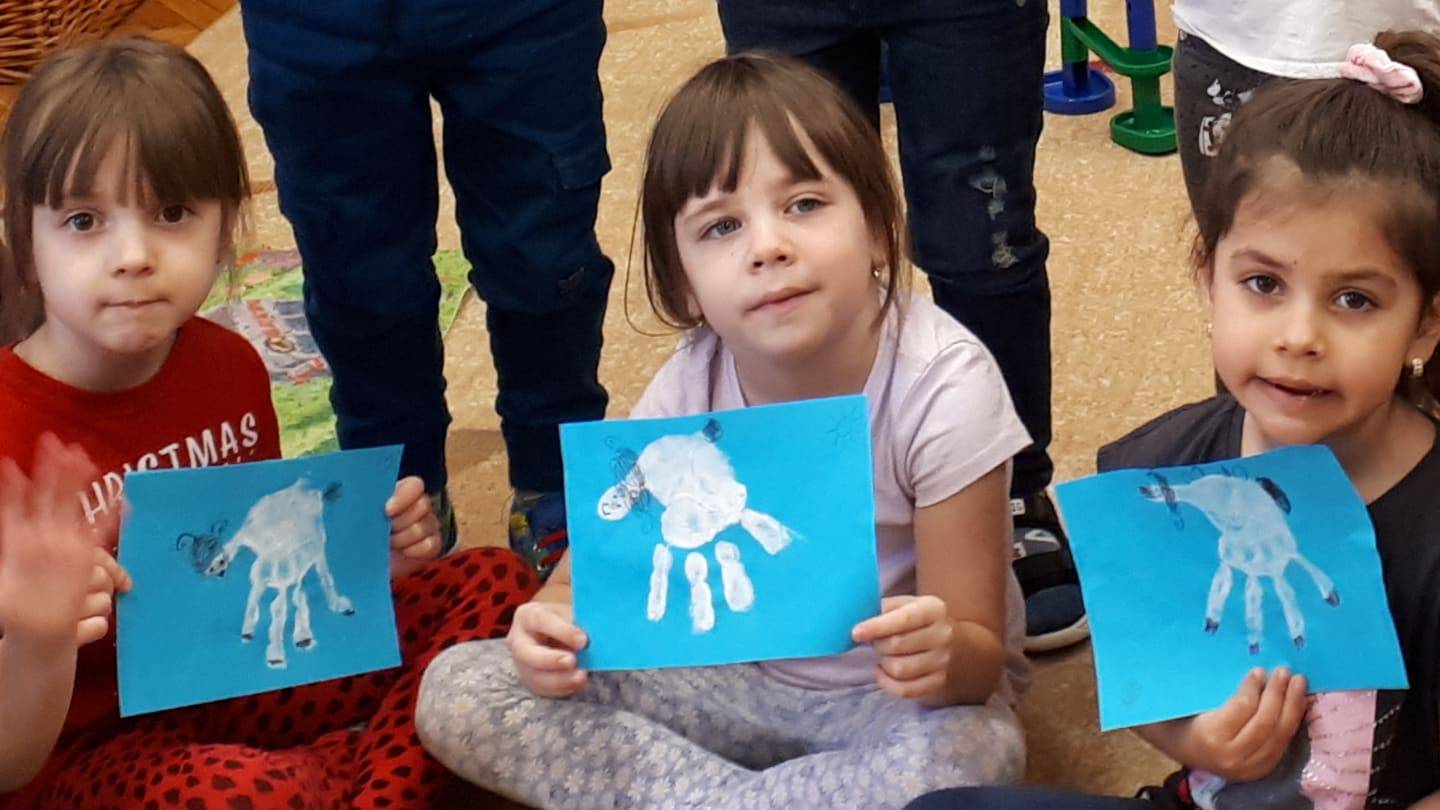 Megbeszéltük a kisfilmben történteket, majd szívesen csatlakoztak a kiskecske tenyérnyomatos elkészítéséhez. A foglalkozás végén meghallgatták, majd ők is énekelték az „A part alatt…” c. népdalt.
