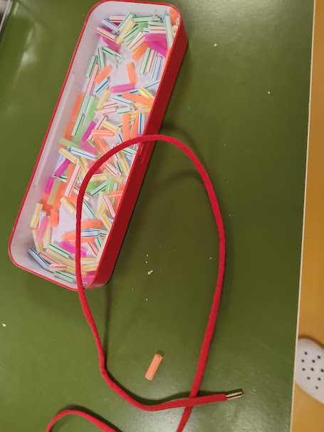 -A láncra fűzött csíkocskákból vigaszfűzér készül, annak adom, akit megbékítek, hogy mosolyogjon rám.