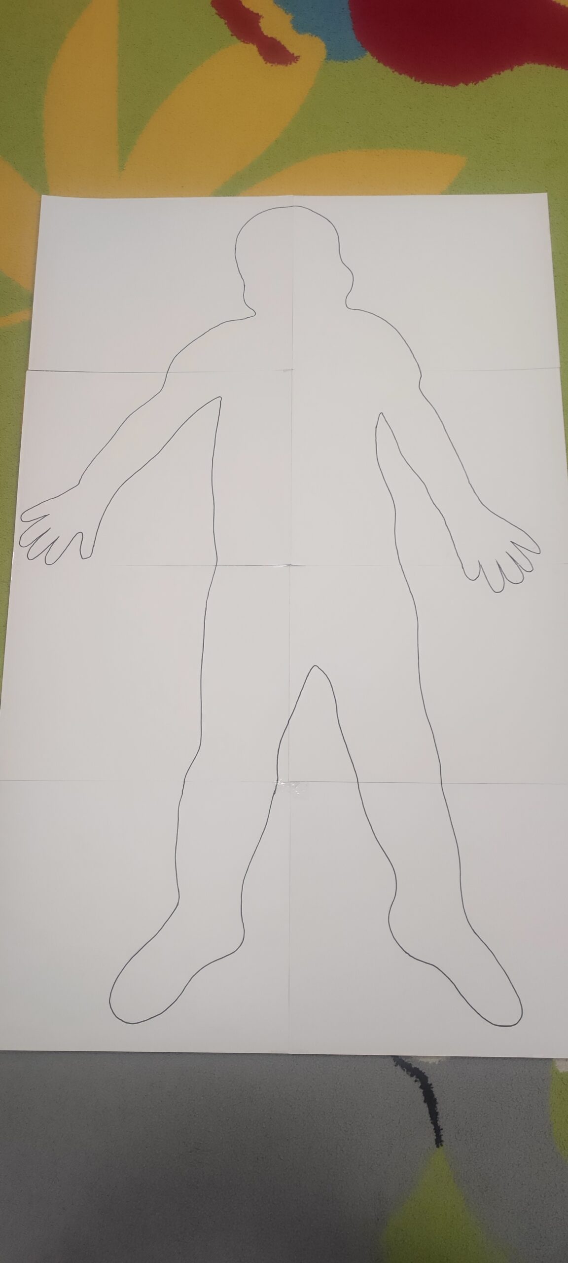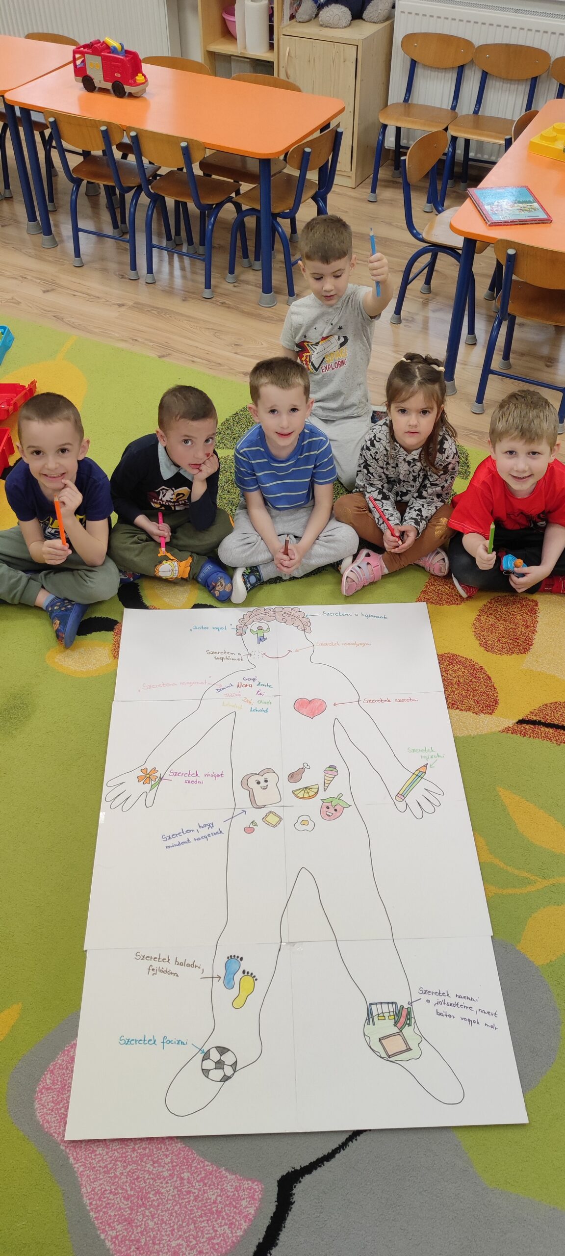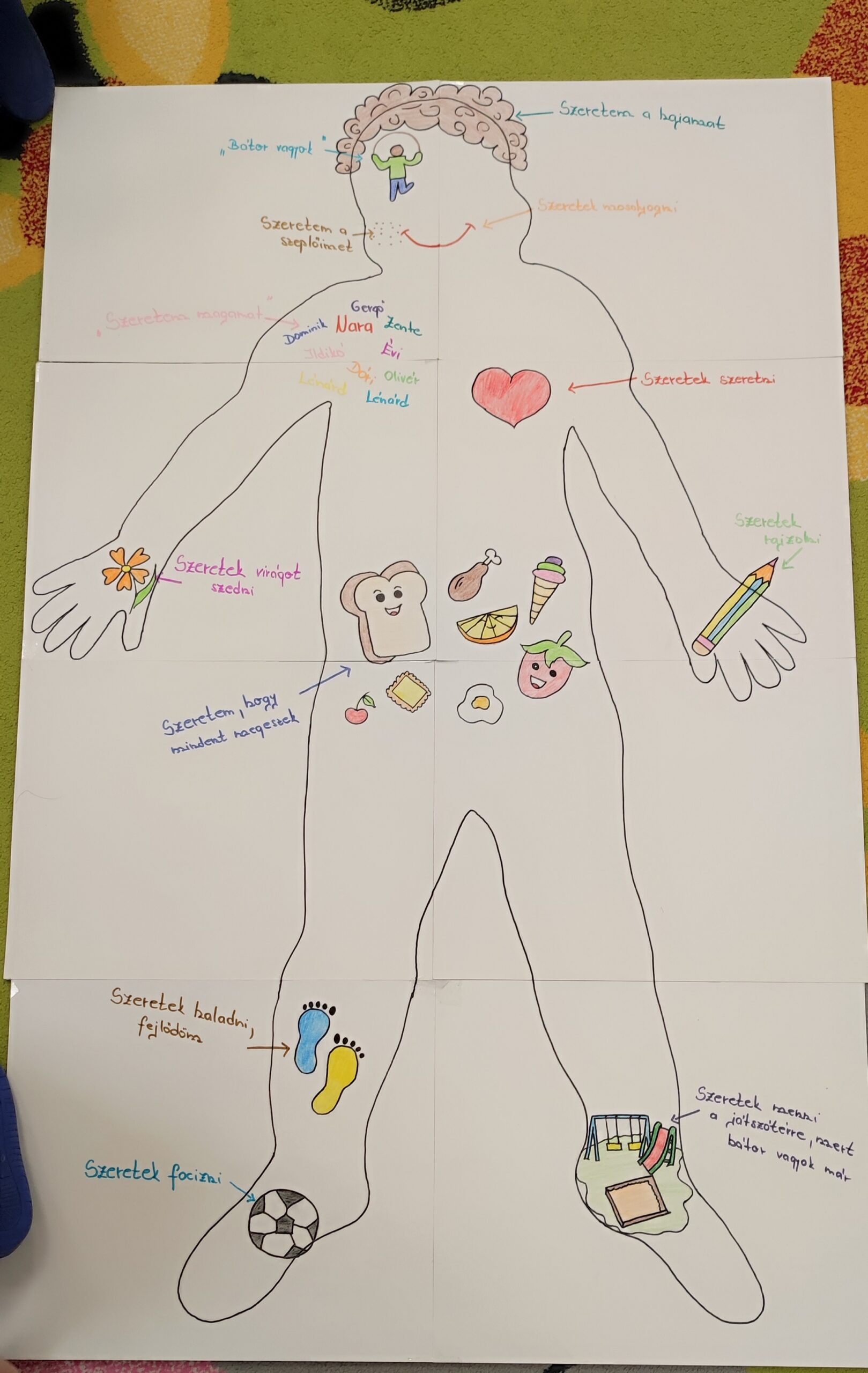 Ez az alkotás a feltétel nélküli önszeretet témájából készült.A gyerekekkel közösen körberajzoltunk egy emberi testet, majd megbeszéltük, mi mindent szeretnek magukban,és mi okoz nekik örömet.Ezután rajzokkal és szavakkal jelöltük a testen belül és kívül is azokat a dolgokat,amiket szeretnek: például kedvenc tevékenységeiket, ételeiket, tulajdonságaikat és érzéseiket.