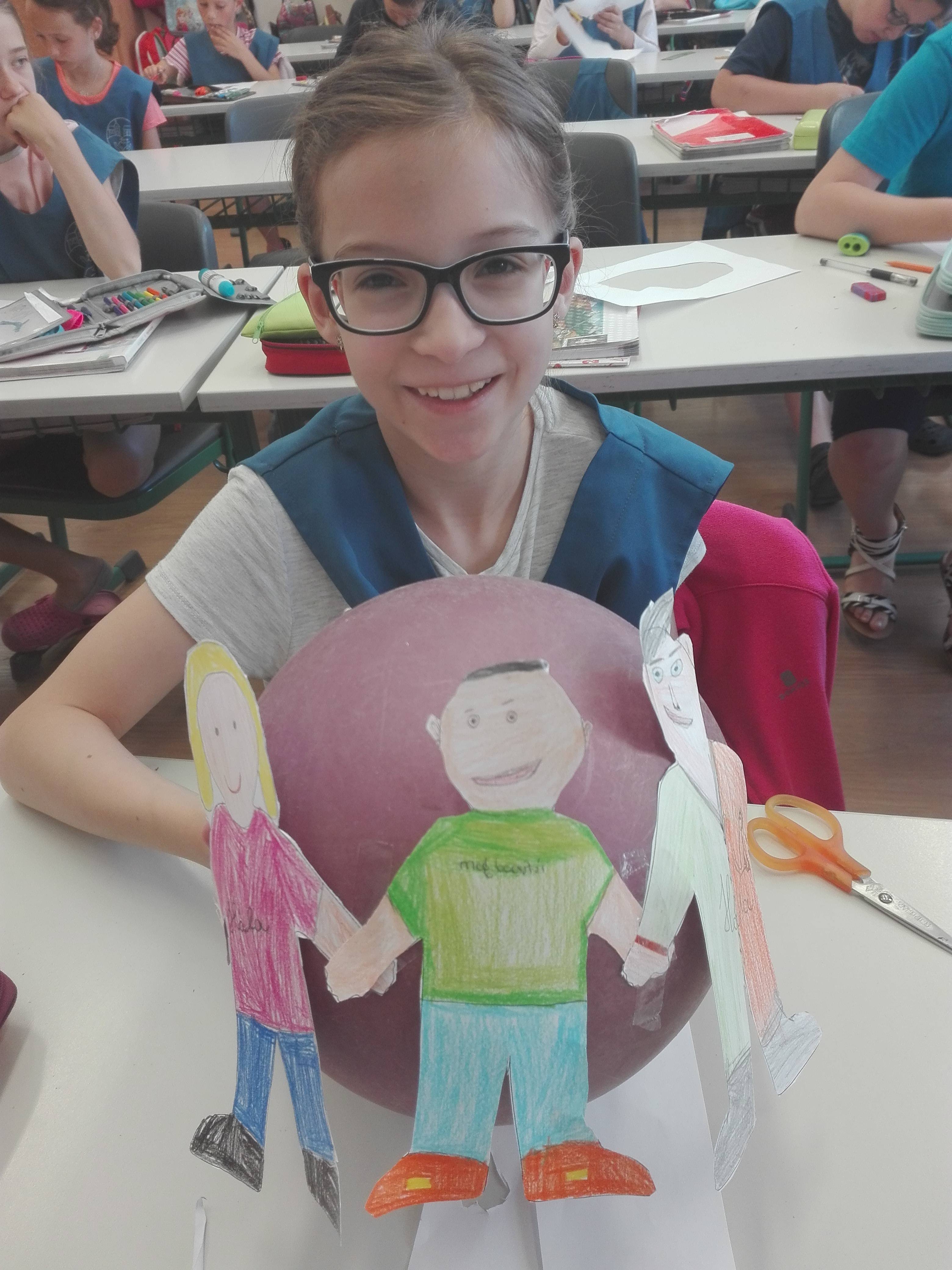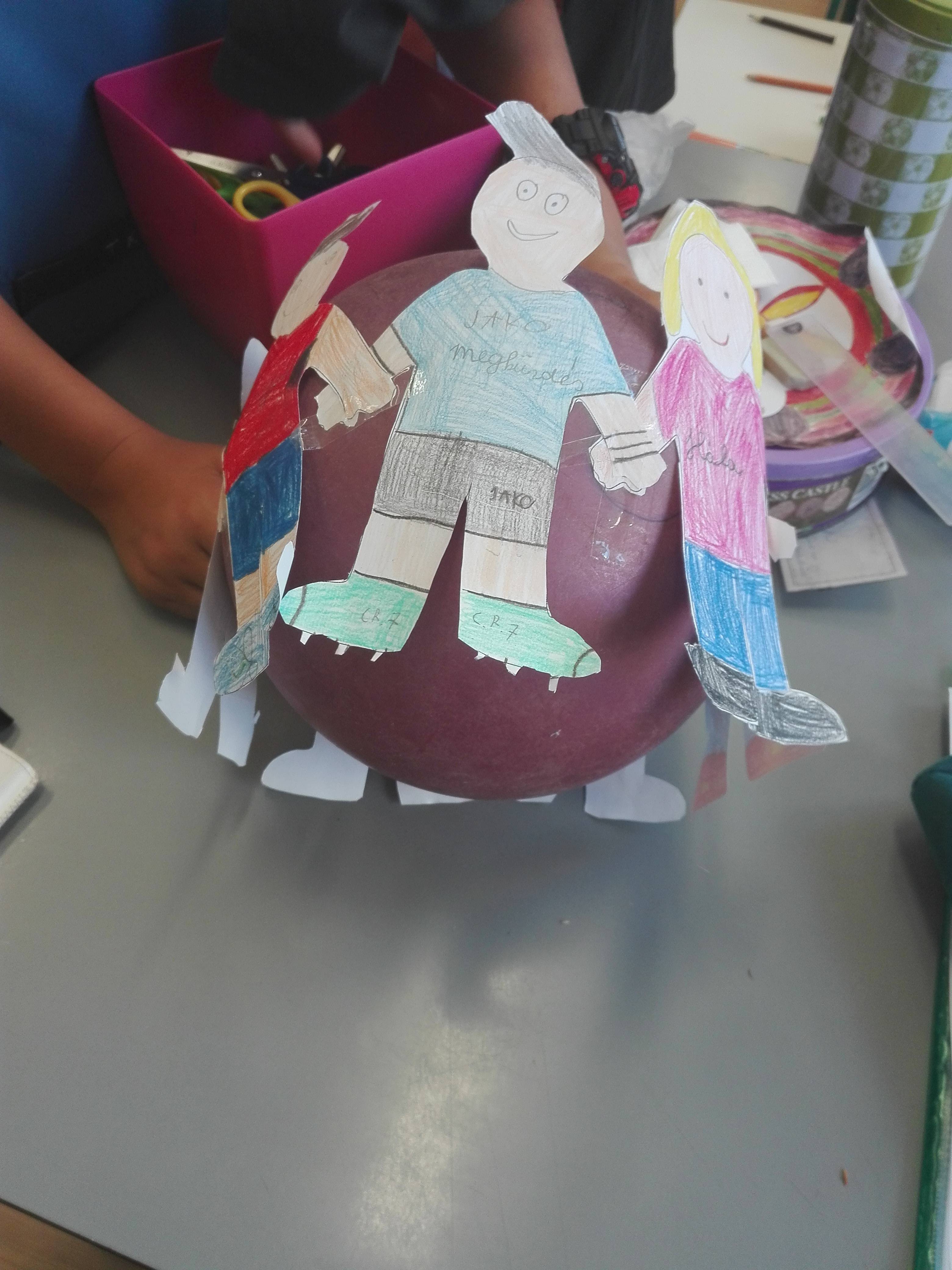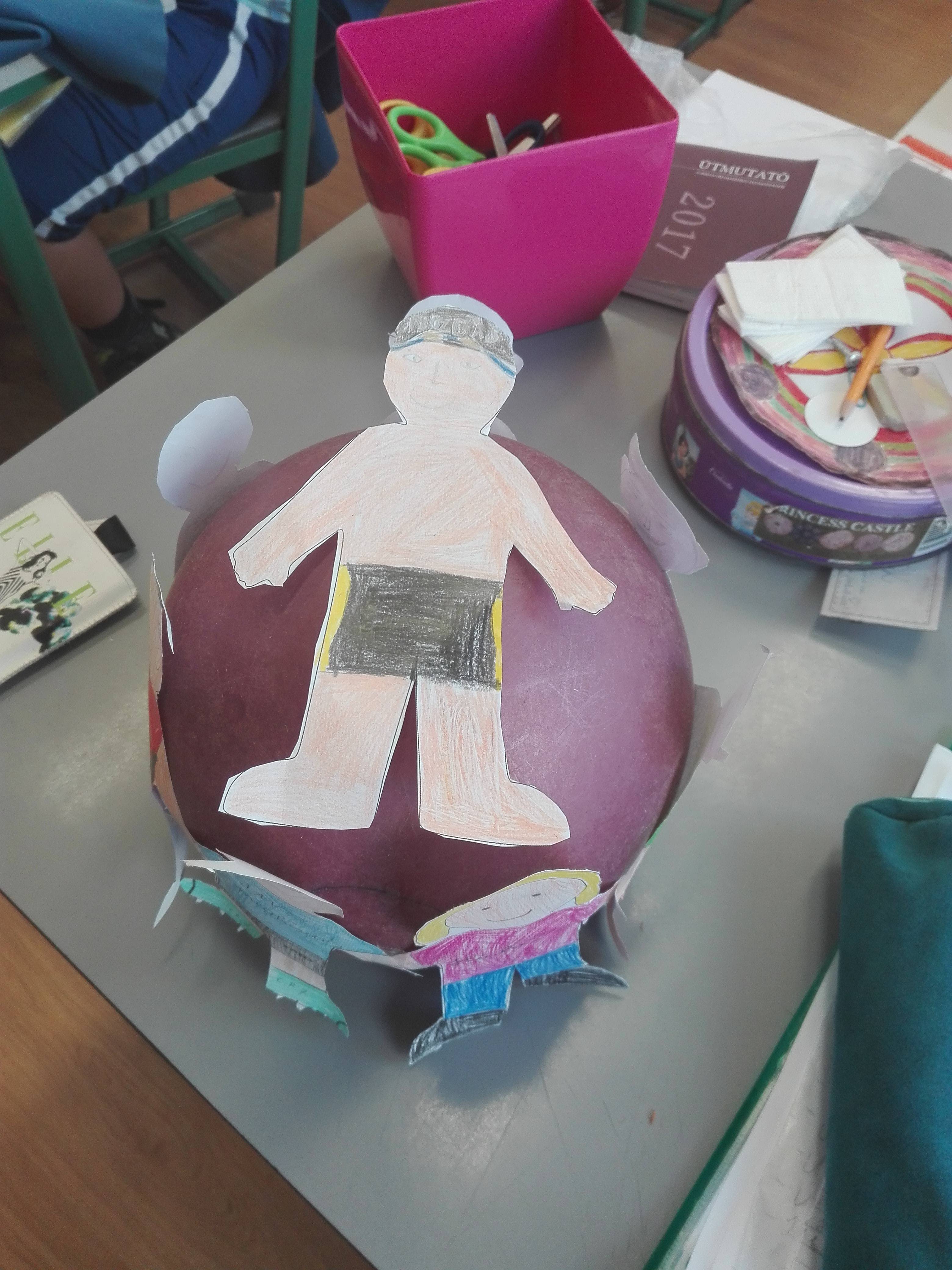 A sablonemberüket, olyan ruhába „öltöztették”a gyerekek, ami megmutatja, hogy számukra mi a legjárhatóbb út a boldogsághoz. Hogy a többi se menjen feledésbe, minden hónapból választottunk egy emberkét, akit egy labdára ragasztottunk. Kézen fogta egymást a Hála, a Cél, a Mozgás és a többiek. 🙂