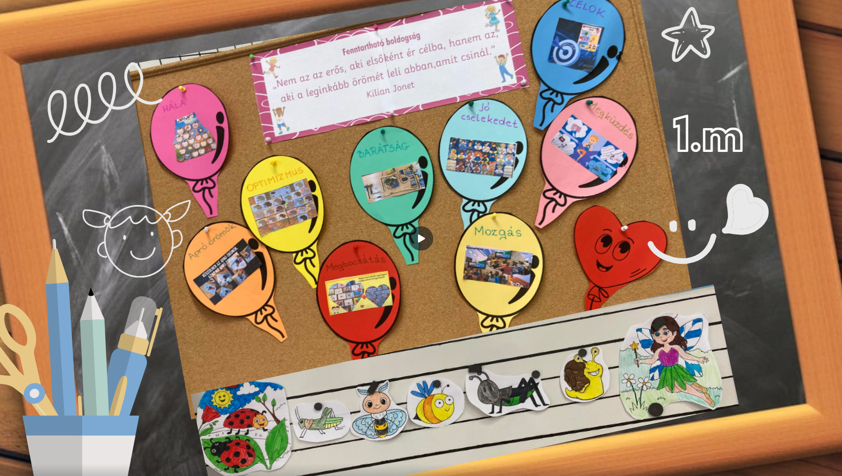 A mai órán felelevenítettük az egyes hónapok óráit videofilmjeink segítségével. A gyerekek elmondhatták, hogy az adott órákon mi tetszett a legjobban vagy esetleg nem tetszett. Közben jelképesen az egyes témaköröket felragasztottuk egy-egy lufira és egy nagy luficsokrot alkottunk belőle. A gyerekek szavazhattak a kedvenc témájukra és megfogalmazták, hogy mit visznek magukkal belőlük. Ezután megismerkedtünk „A katica elveszett pöttyei” mesével és megvitattuk, hogy mitől lehetett a boldog a katica.