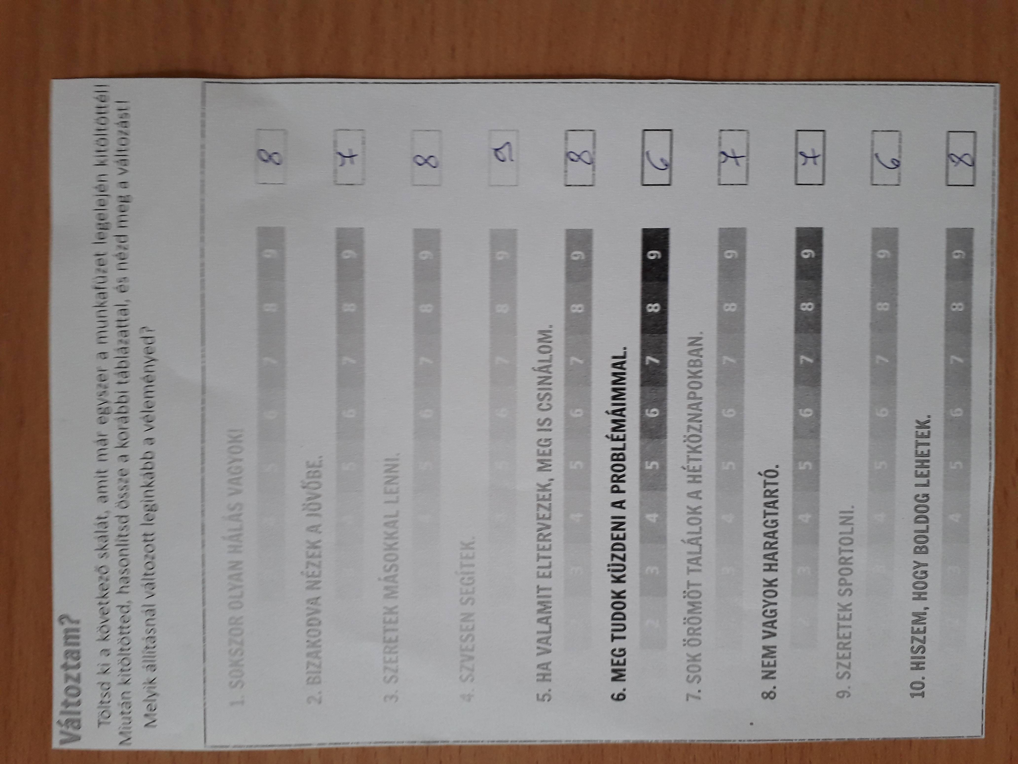 Megbeszéltük, hogy milyen tapasztalatokkal zárjuk a Boldogságórás foglalkozásainkat. Kitöltöttek a gyerekek egy skálát, amin értékelték, hogyan változott a szemléletük az eltelt hónapokban.