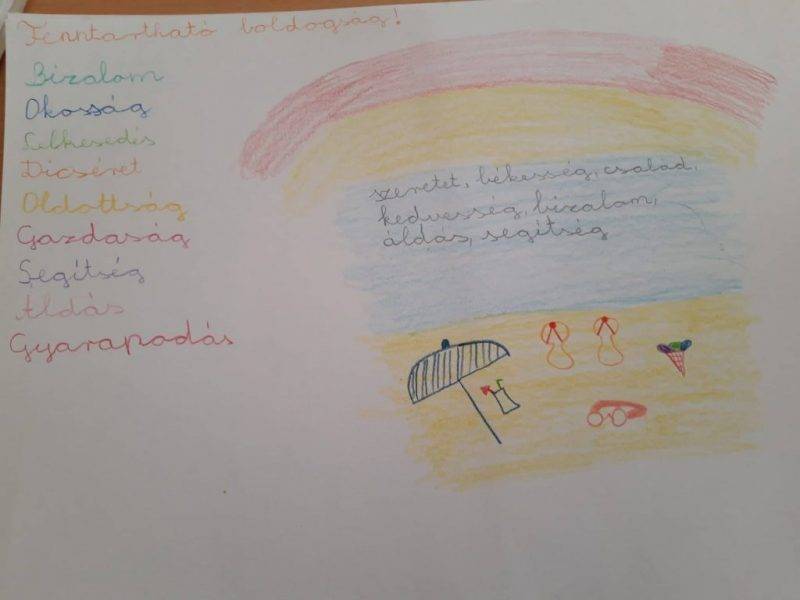 Az év utolsó támájához ékeztünk. Egy kicsit szomorúan fogadták a gyerekek. Lelkesen írtak a BOLDODÁG szó betűivel újabb szavakat. Elképzeltük magunkat, hogy a tengerparton vagy a strandon vagyunk. Mi kell ahhoz, hogy boldogok legyünk? -volt a kérdés. Mindenki a saját boldogságkoktélját írta és rajzolta meg. Köszönjük az egész évi anyagot és a lehetőséget, hogy részt vettünk a Boldogságóra programjában. Jó pihenést és időtöltést a nyárra sok boldogsággal fűszerezve!