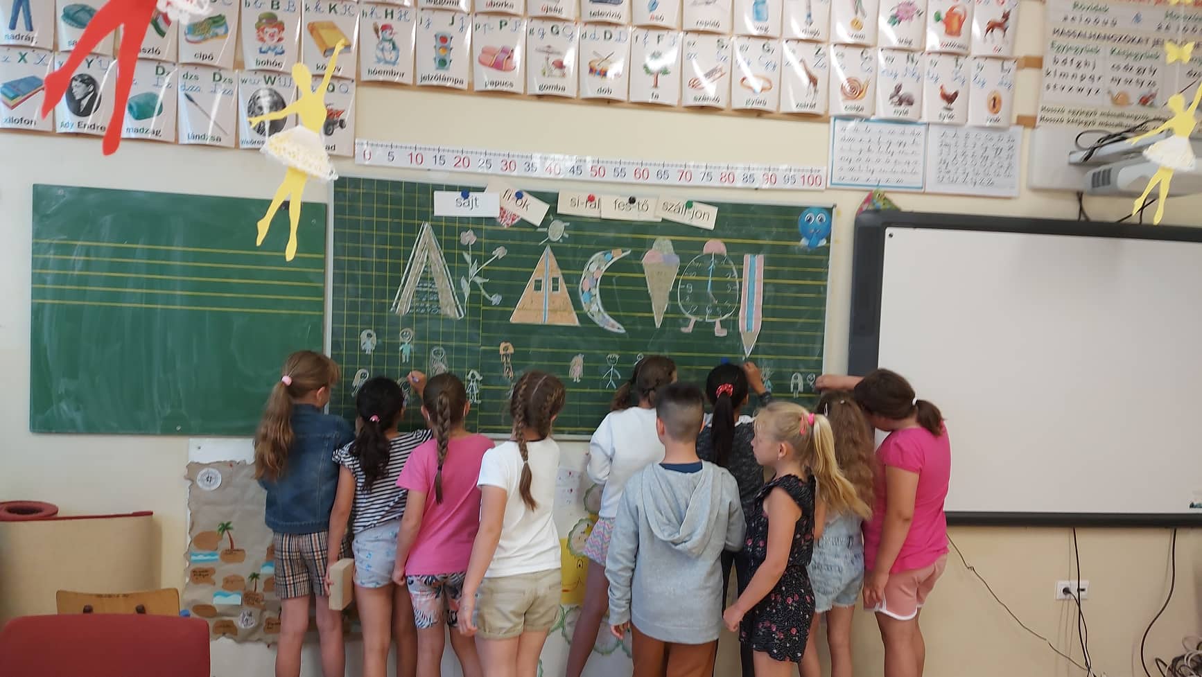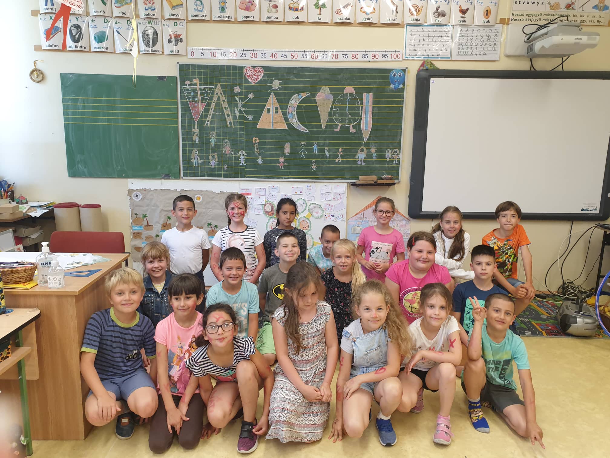 A második óra elején ismét meghallgattuk a hónap dalát, közben színeztek a gyerekek „Ügyes vagyok, okos vagyok, mindig magabiztos vagyok, mindig minden helyzetben a legjobbra számítok!”. Táblára az elmúlt napokban felkerült a VAKÁCIÓ szó egy-egy betűje, alá mindenki lerajzolta saját magát, természetesen nagy mosollyal az arcán. A zárókörben megfogalmazták, hogy milyen gondolattal lettek gazdagabbak. A második órát is meditációval zártuk.