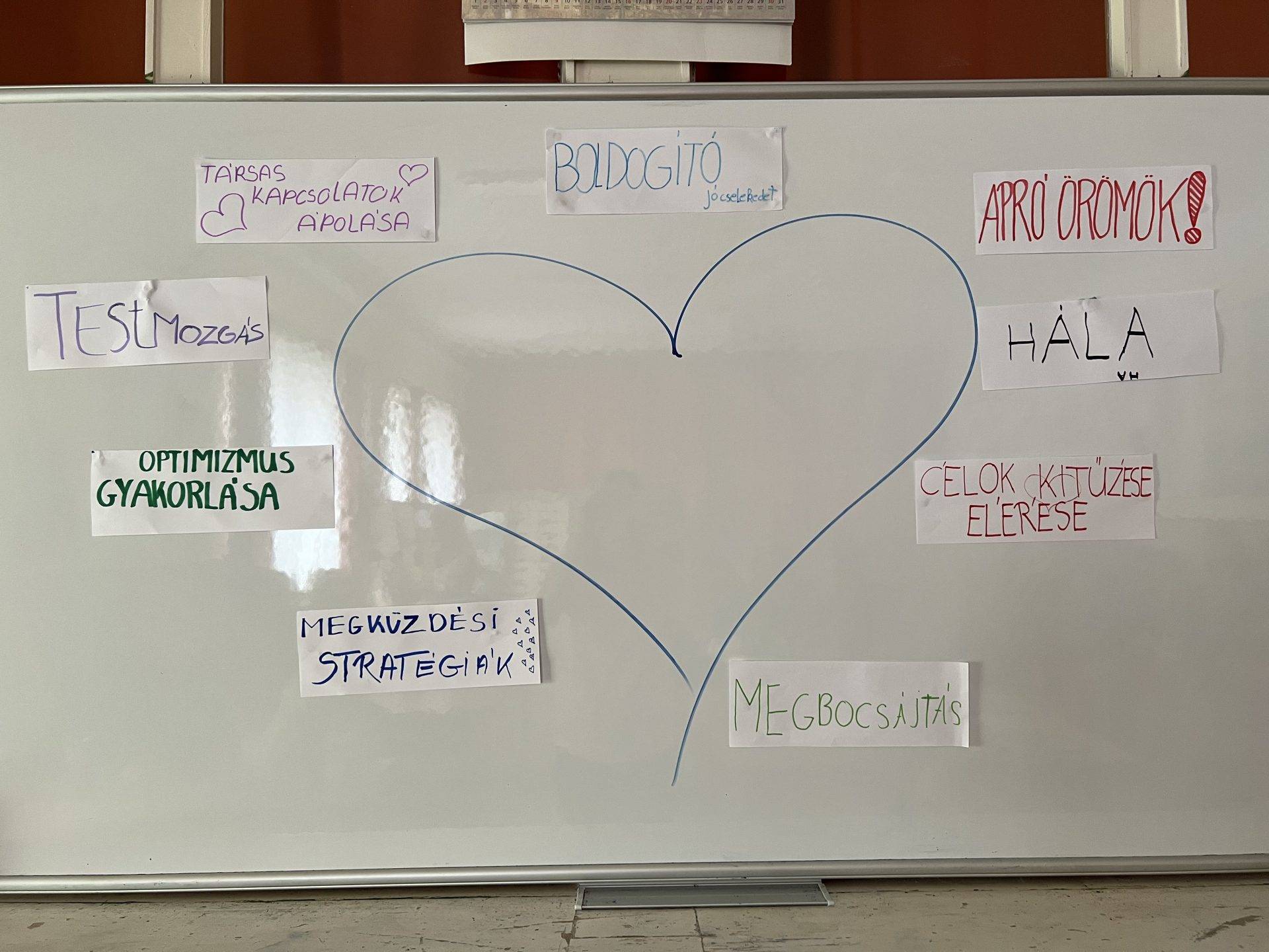 Egy szívet a táblára rajzolunk, a tanulók mellé írják, milyen témákkal foglalkoztunk ebben a tanévben. (gyurmaragasztó, filc)