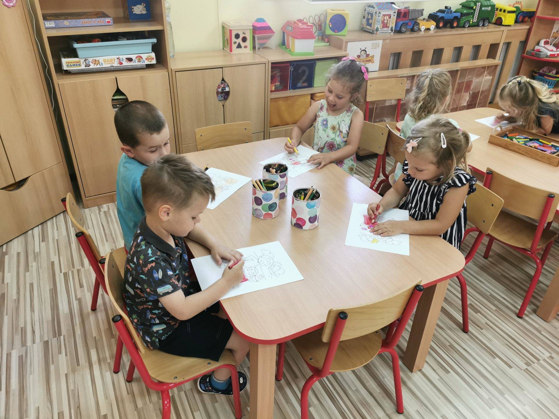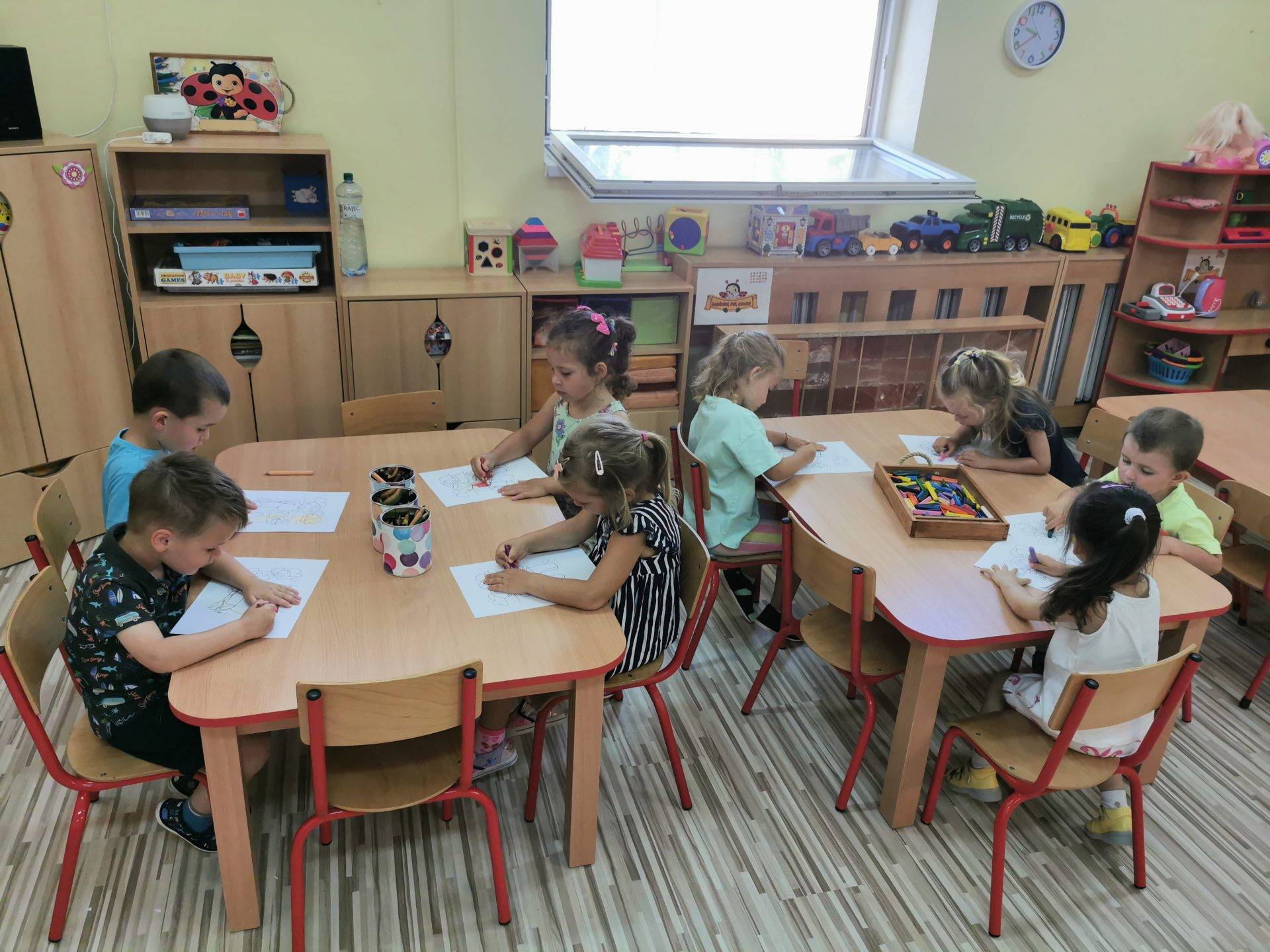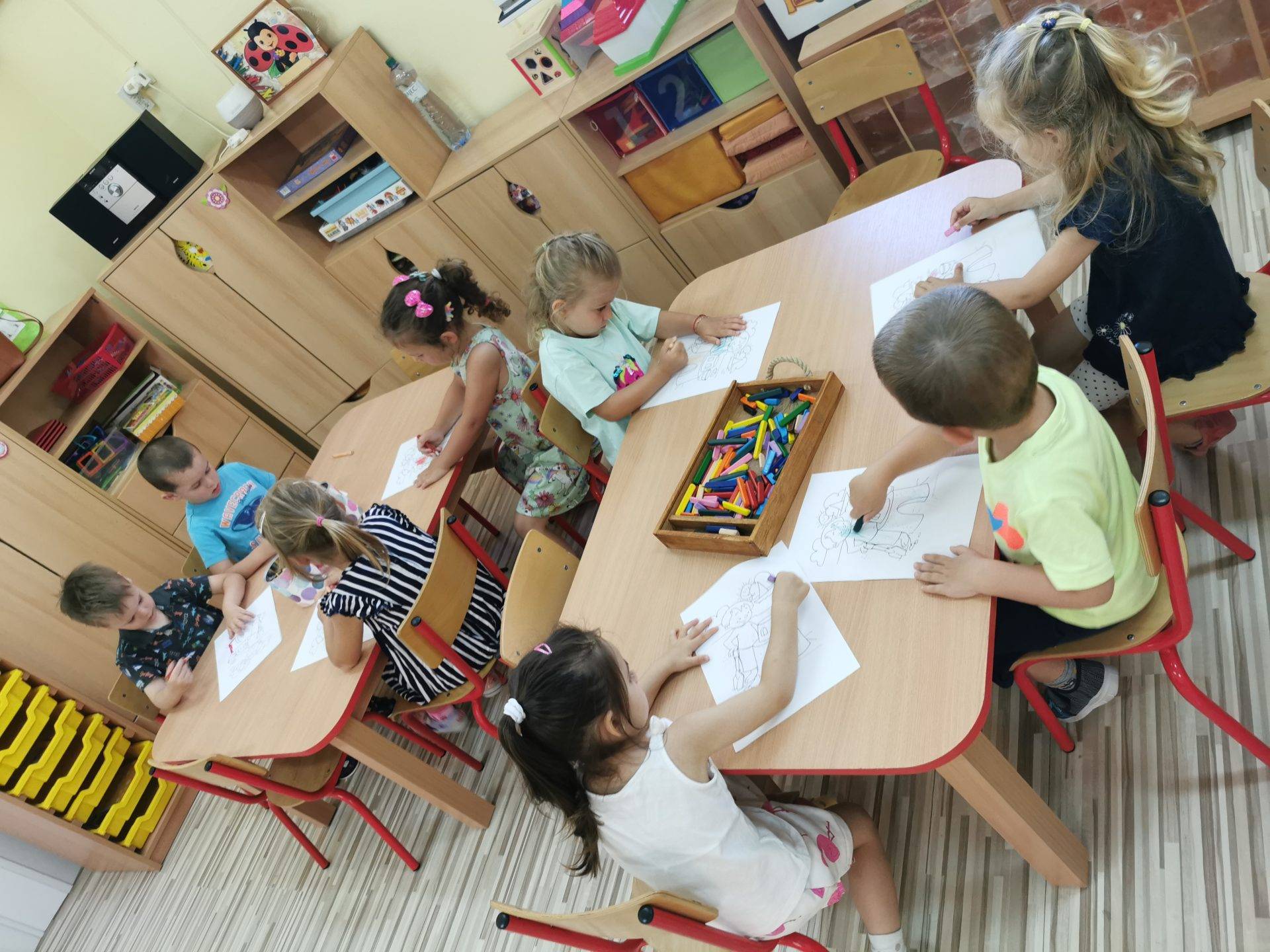 Majd a gyerekek az asztalokhoz ülve egy nyári témájú képet színeztek, festettek ki színesceruzákkal.