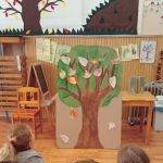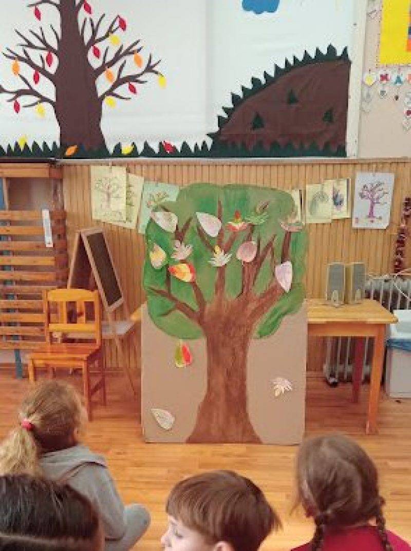 A maci csoportos óvodások a bölcs Galaxis fát úgy képzelték el, mint egy igazi, élő fát. Mindenki készített egy falevelet, melyet egyesévelfelraktak a fára, majd elmondták, milyen ajándékot kapnak a fától. Felidéztük a boldogságórával kapcsolatos emlékeinket, végül meghallgattuk a hónap dalát: Jobb veled a világ.