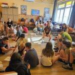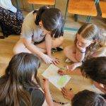 Az órát gesztuskörrel indítottuk, ahol a tanulók pillanatnyi hangulatukról tudtak egy-egy gesztussal visszajelzést adni. Első feladatként felolvastam nekik a Fehér és a Fekete Farkasról szóló őslakos tanmesét, amelynek segítségével a mindannyiunkban ott lakozó pozitív és negatív érzelmeket és tulajdonságokat vettük számba. Példákat soroltunk arra, mi történt, amikor valaki észrevett magán egy negatív, romboló érzést, gondolatot, és megpróbált azon változtatni. Ezután arra kértem a tanulókat, hogy gyűjtsenek össze boldogságfokozó technikákat, amelyek segítettek nekik az elmúlt évben átlendülni a nehezebb időszakokon. Az óra további részében csoportokban meg kellett papíron alkotniuk a Fenntartható Örömváros egy-egy szegletét, fontos területét: Hogy marad fenn a városlakók egészsége? Hogy illeszkedik a város minél organikusabban a természet rendjébe? Hogy jutnak el a városlakók minél egyszerűbben a munkahelyükre? Mi történik a szeméttel, a szükségtelen tárgyakkal? Milyen értékeket sajátítanak el a gyerekek? Az elkészült rajzok alapján a csoportok szóvivői ezekre a kérdésekre adott válaszaikról számoltak be az egész osztálynak. Ezután szoborként megjelenítettük a térben a Szorongások Szigetét és ennek ellenpólusaként az Örömvárost. Azt kértem, mondjanak ötleteket, milyen hídon át juthatnak el az emberek a Szorongások Szigetéről Örömvárosba. Ennek megfelelően kértem, gondolják át az idei tanévet, honnan hova jutottak el.