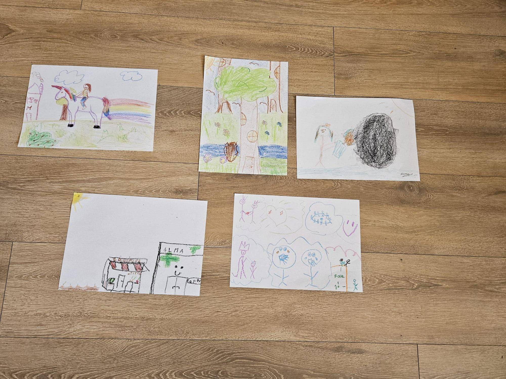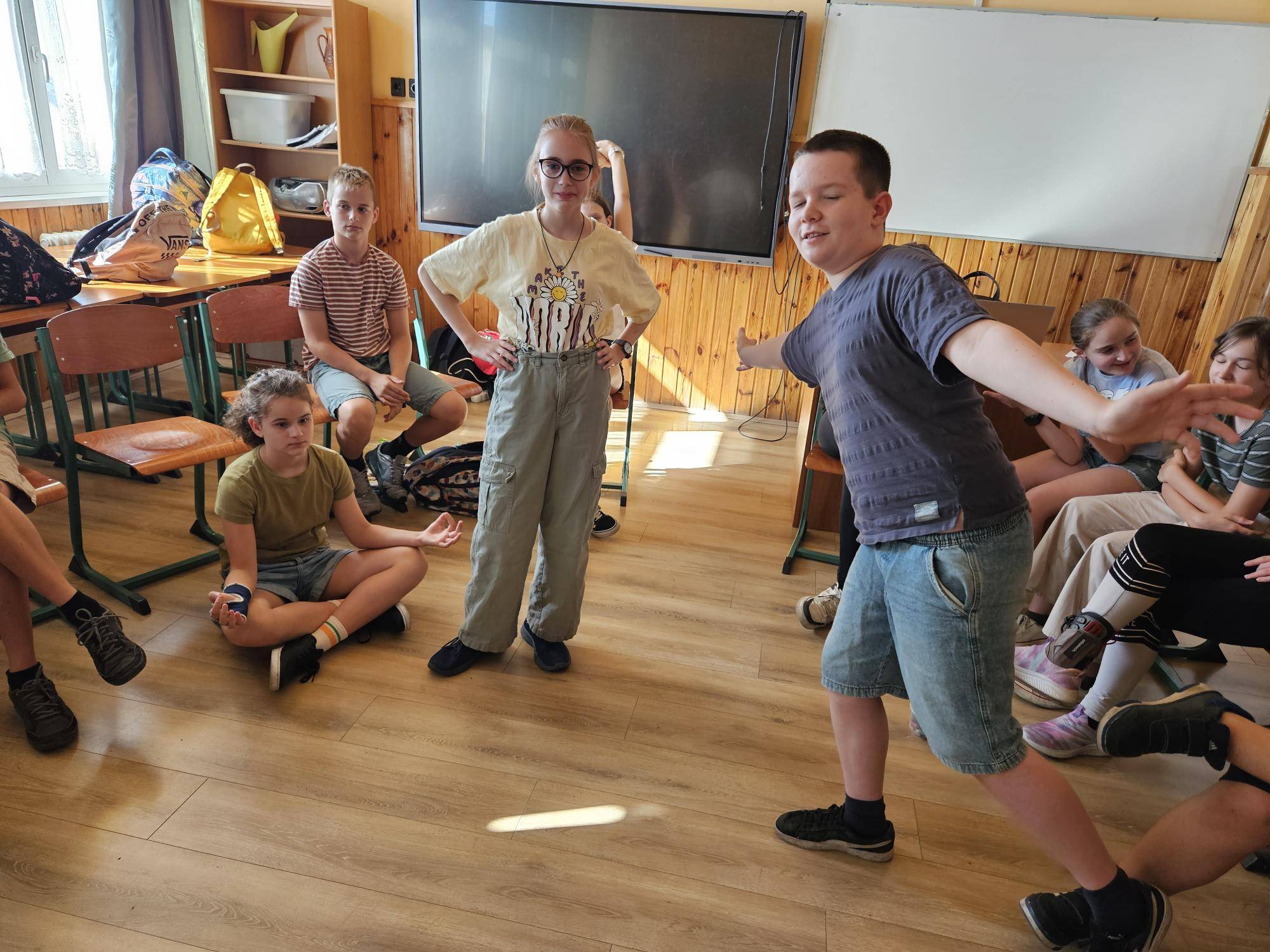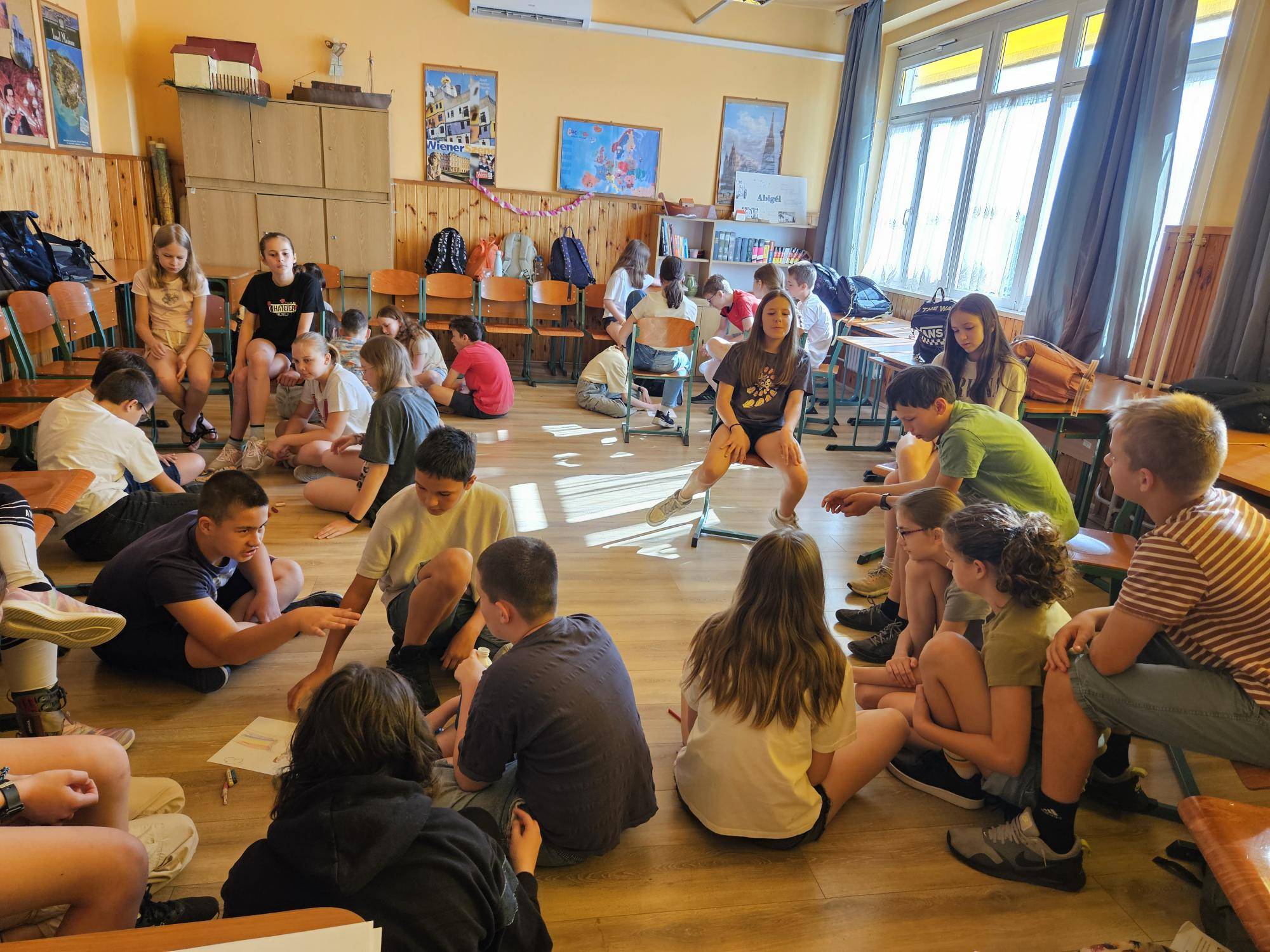 Az órát gesztuskörrel indítottuk, ahol a tanulók pillanatnyi hangulatukról tudtak egy-egy gesztussal visszajelzést adni. Első feladatként felolvastam nekik a Fehér és a Fekete Farkasról szóló őslakos tanmesét, amelynek segítségével a mindannyiunkban ott lakozó pozitív és negatív érzelmeket és tulajdonságokat vettük számba. Példákat soroltunk arra, mi történt, amikor valaki észrevett magán egy negatív, romboló érzést, gondolatot, és megpróbált azon változtatni. Ezután arra kértem a tanulókat, hogy gyűjtsenek össze boldogságfokozó technikákat, amelyek segítettek nekik az elmúlt évben átlendülni a nehezebb időszakokon. Az óra további részében csoportokban meg kellett papíron alkotniuk a Fenntartható Örömváros egy-egy szegletét, fontos területét: Hogy marad fenn a városlakók egészsége? Hogy illeszkedik a város minél organikusabban a természet rendjébe? Hogy jutnak el a városlakók minél egyszerűbben a munkahelyükre? Mi történik a szeméttel, a szükségtelen tárgyakkal? Milyen értékeket sajátítanak el a gyerekek? Az elkészült rajzok alapján a csoportok szóvivői ezekre a kérdésekre adott válaszaikról számoltak be az egész osztálynak. Ezután szoborként megjelenítettük a térben a Szorongások Szigetét és ennek ellenpólusaként az Örömvárost. Azt kértem, mondjanak ötleteket, milyen hídon át juthatnak el az emberek a Szorongások Szigetéről Örömvárosba. Ennek megfelelően kértem, gondolják át az idei tanévet, honnan hova jutottak el.