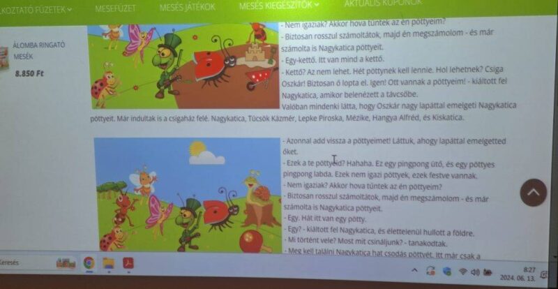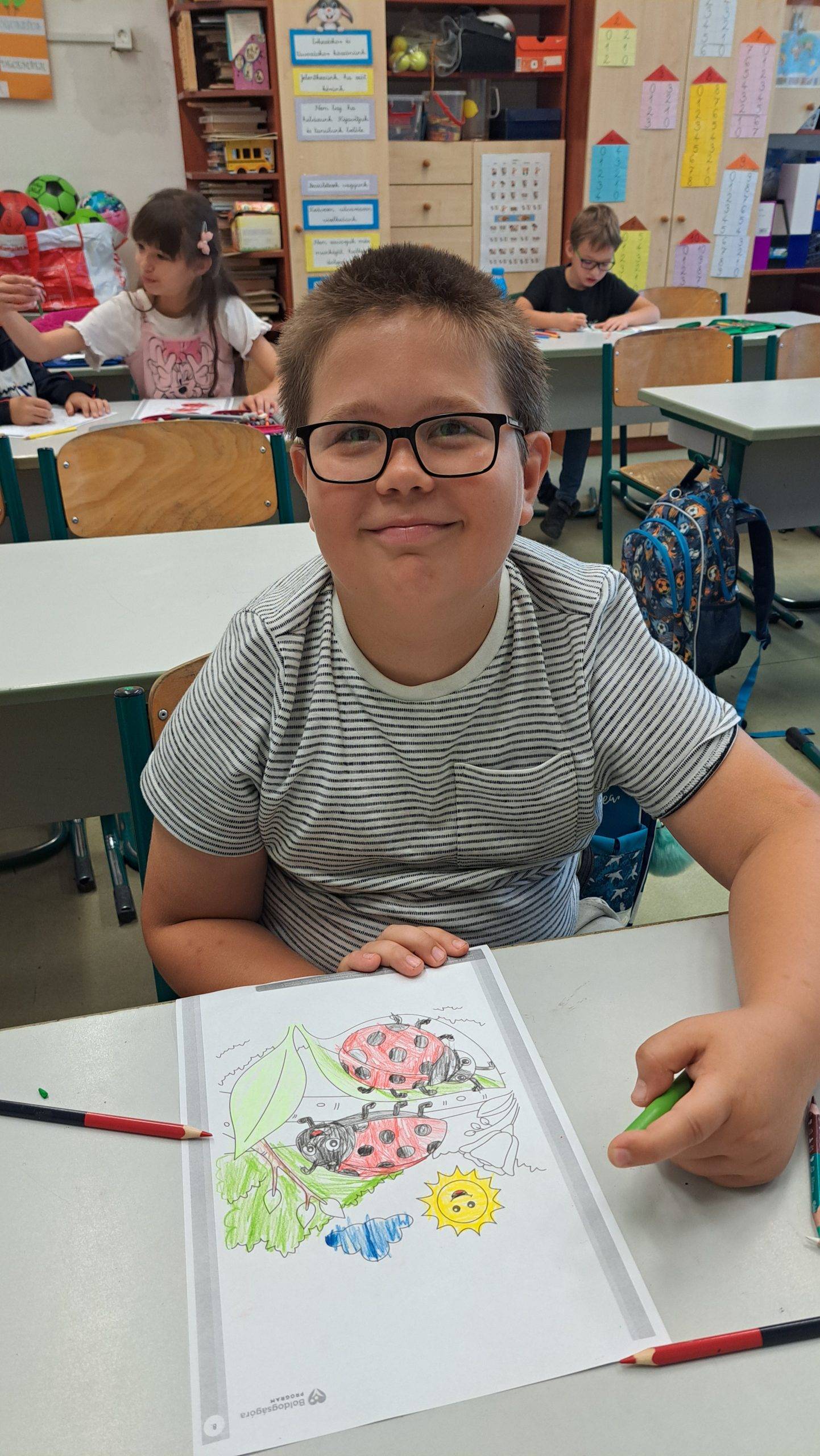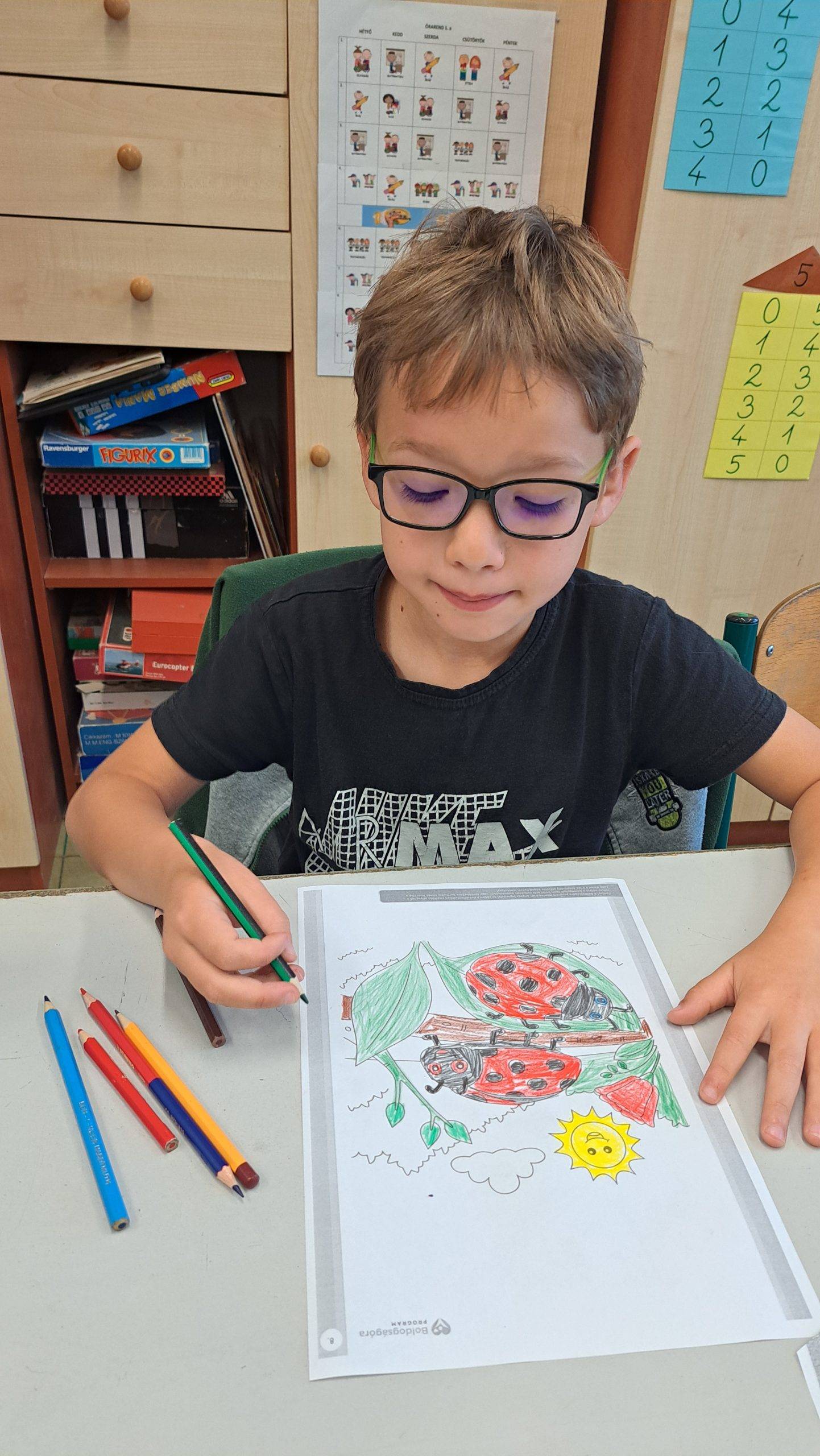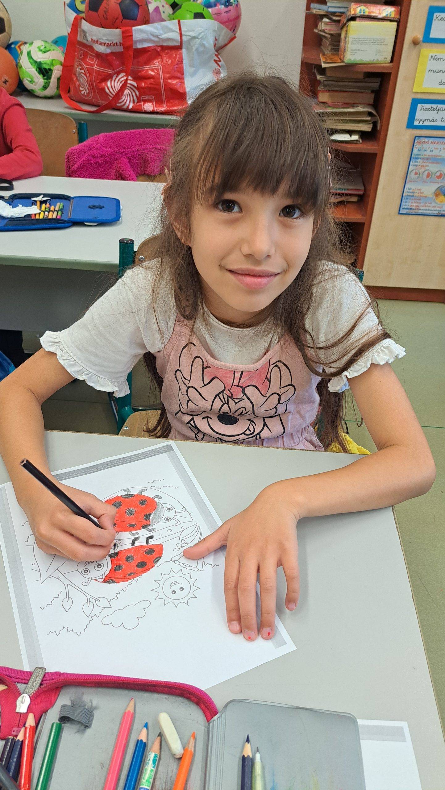 Ezután elolvastuk a Katica elveszett pöttyei című mesét. Beszélgettünk arról, hogy milyen érzést okozott nekik saját maguknak a szereplők viselkedése. Volt-e olyan érzésük, amit kellemetlennek éltek meg. Kiszíneztek egy nekik tetsző szereplőt: Kiskaticát, Nagykaticát, Tücsök Kázmért, Lepke Piroskát, Mézikét, Hangya Alfrédot, Csiga Oszkárt, az Igazságos Tündért, vagy egy képkockát a meséből.