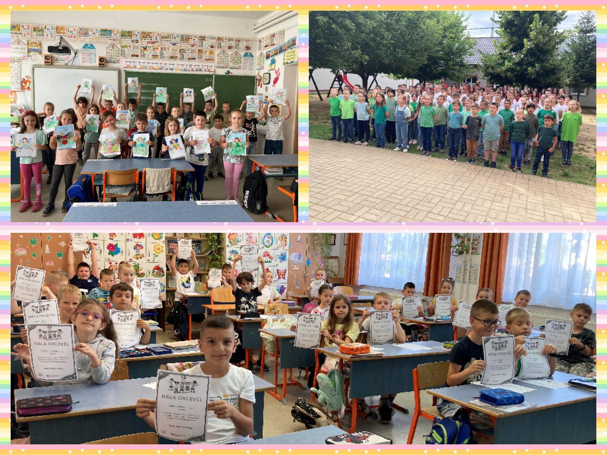 A tanév utolsó hónapjának júniusi boldogságóráin (Fenntartható boldogság) összegzést végeztünk a gyerekekkel. Végigbeszéltük a 10 hónap témáit, melyek voltak a kedvencek. Hogyan lehet hatékonyan használni a tanév során megszerzett tudást. Melyik boldogságfokozó technika volt az, amelyiket szívesen alkalmaztak a mindennapi életükben, ami beépült a szokásrendszerükbe. Emlékezetes élményeiket is felidézték. Megfogalmazták, hogy miért érdemes a boldogságukért felelősséget vállalniuk. A Katica elveszett pöttyei c. meséhez a színező sablonokból választhattak. Megfogalmaztuk a mese tanulságait, a társas támogatás jelentőségét hangsúlyoztuk, kellemes és kellemetlen érzéseket soroltak a meséből. A Nemzeti Összetartozás Napjára emlékezve az iskola tanulóival közösen Szarka Tamás: Kézfogás c. dalát énekeltük el. Hálaoklevélben is részesültek. Örömteli, mosolygós arcokat lehetett látni a gyerekeken, amikor az osztályból 12 fő kiváló, 6 fő jeles tanulmányi munkájáért könyvjutalmat vehetett át a tanévzáró ünnepségen.