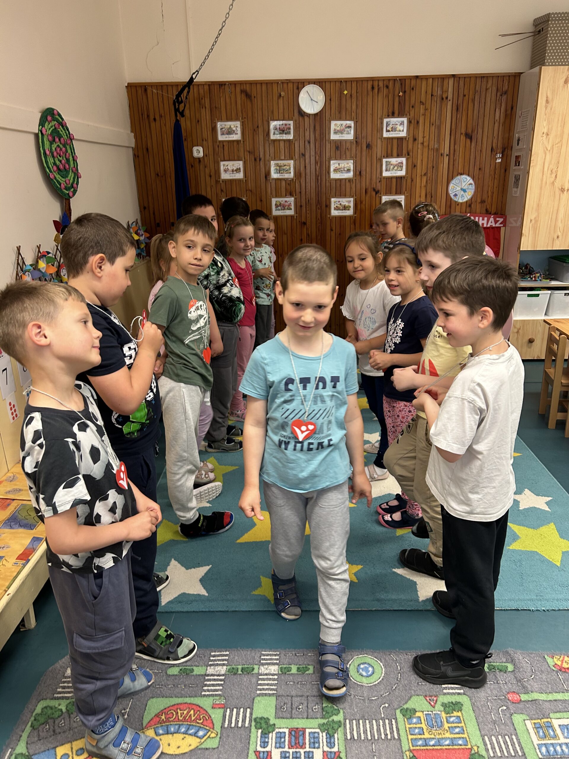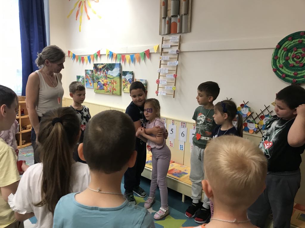 Ráhangolódásként „Szeretet folyosót”alkottunk a gyermekekkel, amin mindenki átkelt s közben elmondtuk a rá jellemző pozitív tulajdonságokat.