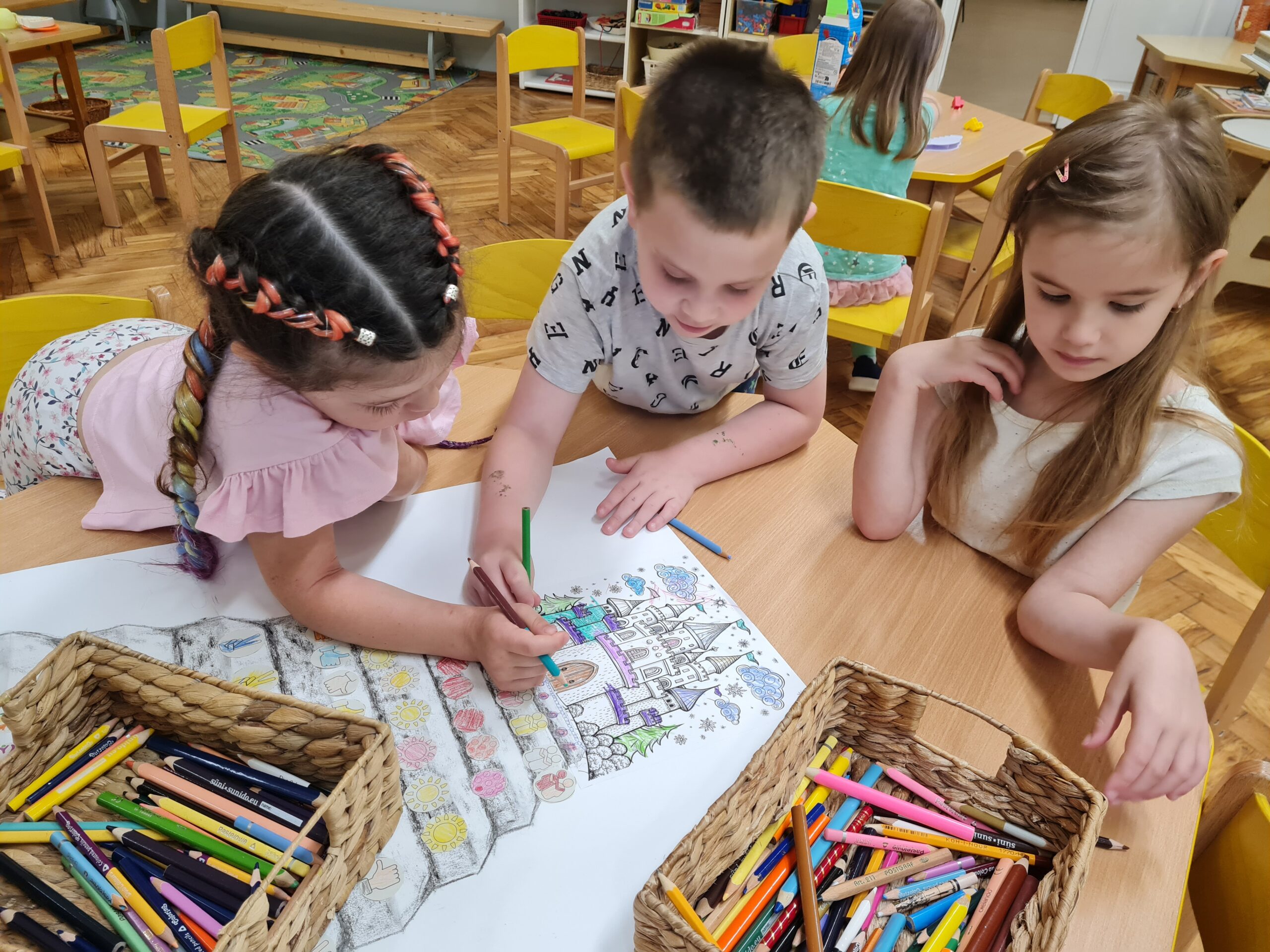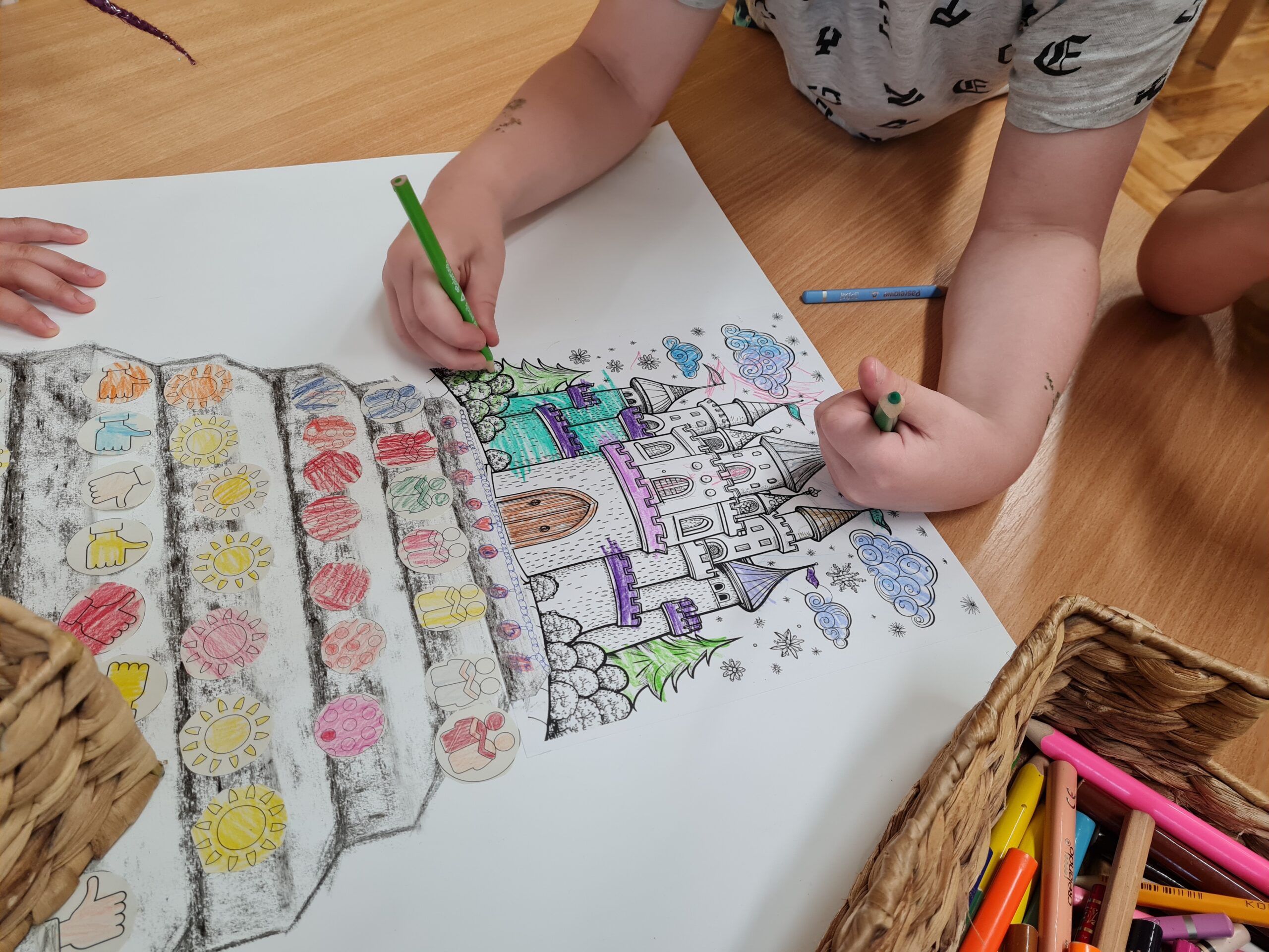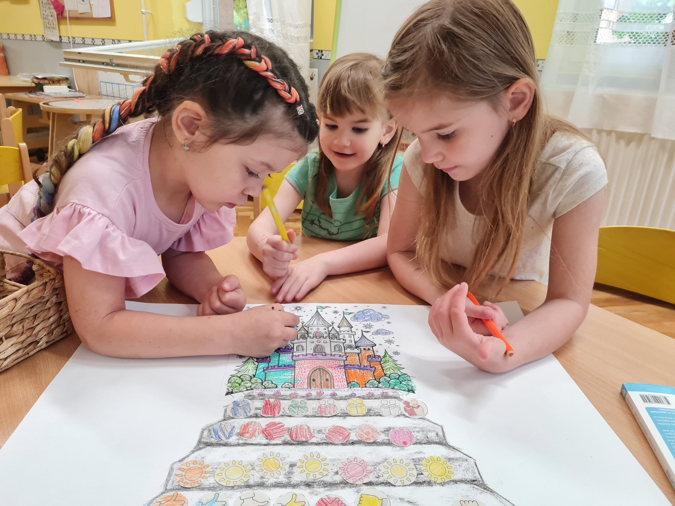 Az utolsó lépcsőfok után kiszínezték a gyermekek a várat valamint a tk. 211. oldalán található mesét is elolvastam nekik. A beszélgető körben pedig a lépcsősort és a várat megcsodálva átismételtük a hónapokat és a hozzájuk kapcsolódó témákat.