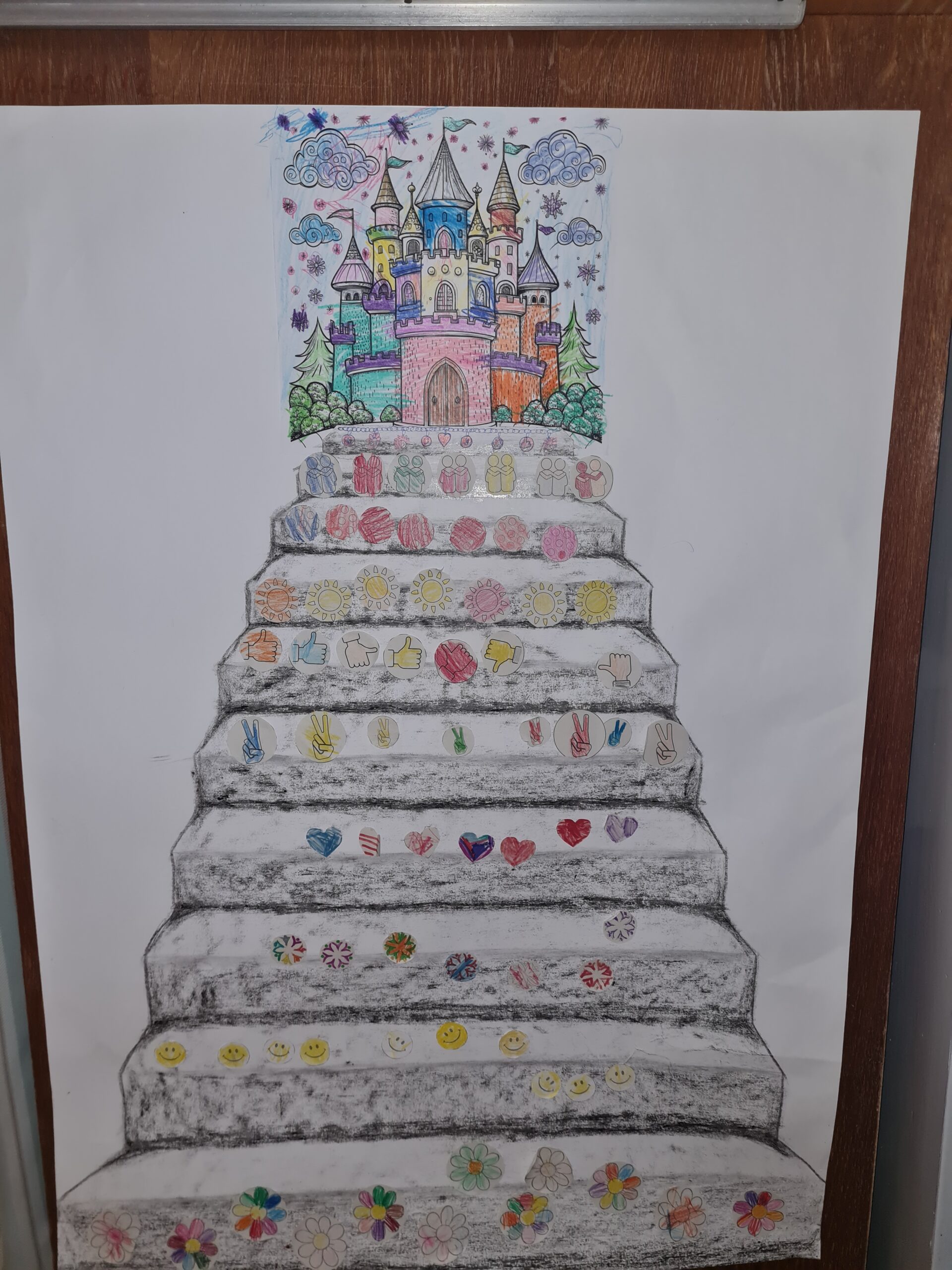 Szeptemberben készítettem egy nagy lépcsősort egy várral, ahova el szeretnénk jutni. Minden hónapban felragasztottuk az adott téma jelét, egyre feljebb jutva a Boldogság várhoz.