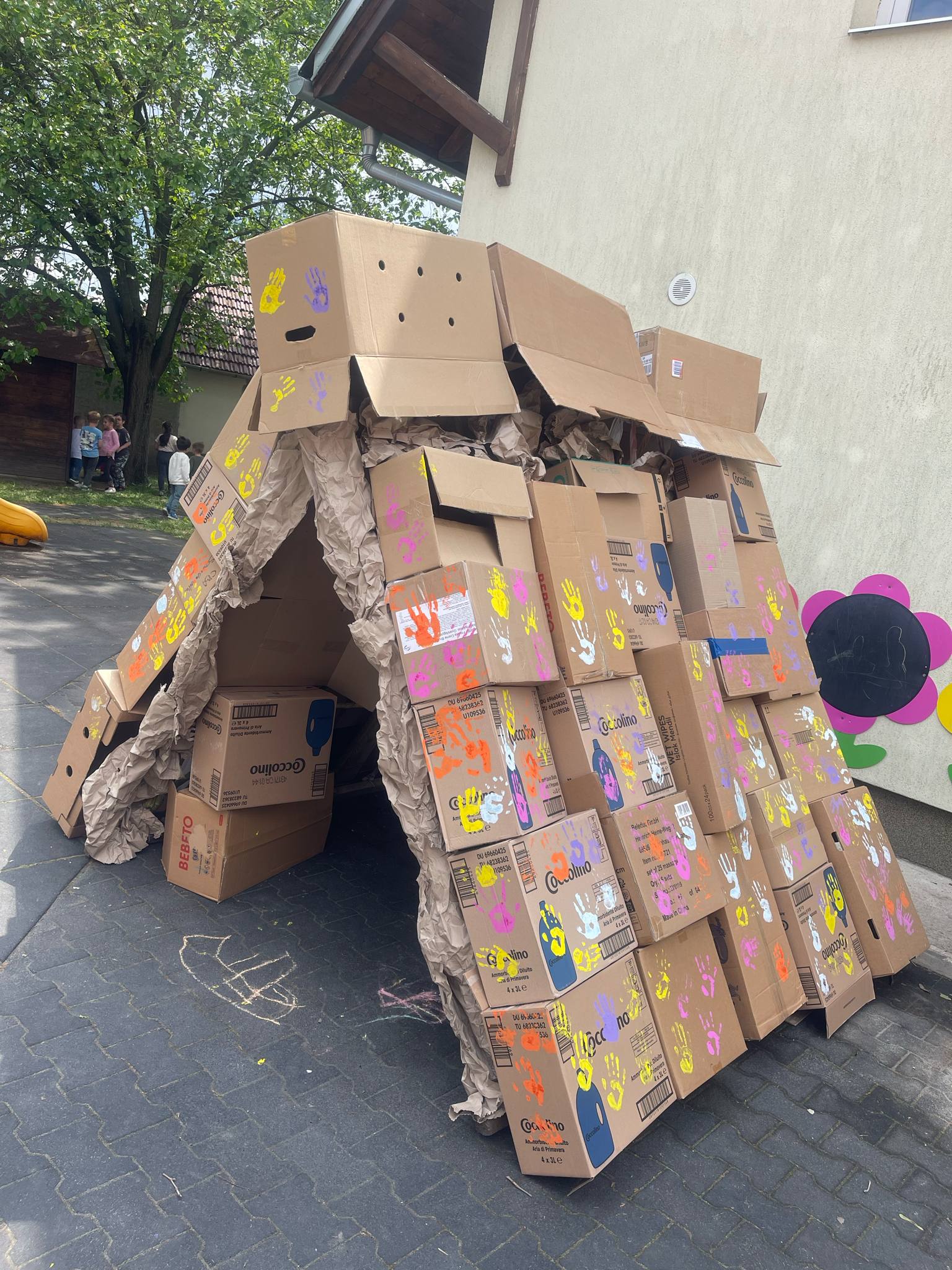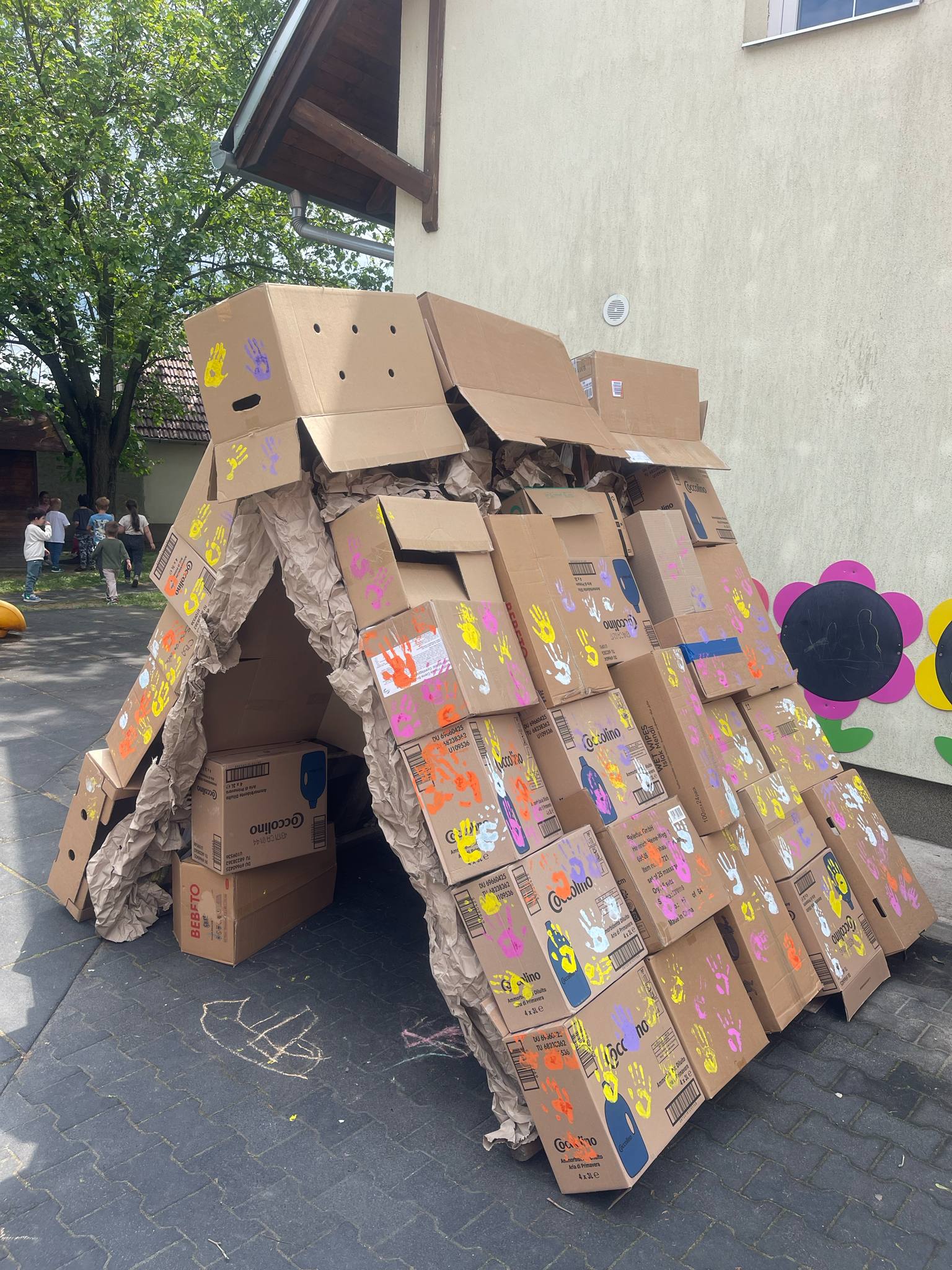 A júniusi hónap témája a fenntartható boldogság. A boldogság nem csupán egy pillanatnyi jó érzés, hanem egy olyan állapot, amit hosszú távon is meg lehet élni, ha tudatosan teszünk érte. A fenntartható boldogság az jelenti, hogy nem csak magunkra gondolunk, hanem a környezetünkre is: másokra, a természetre, a jövőnkre. Amikor hálásak vagyunk a mindennapi dolgokért, amikor figyelmet fordítunk másokra, amikor segítünk valakinek, akkor nem csak ő lesz boldogabb, hanem mi is. Törekedjünk arra, hogy kevesebbet használjuk a digitális eszközöket, több időt tölteni a szabadban, a természetben a gyerekekkel közösen. Ebben a hónapban megrendezésre került a DM által meghirdetett pályázat, ahol fenntartható anyagokból lehetett bunkert építeni, erre a pályázatra a mi óvodánk is jelentkezett, közösen építettünk a gyerekekkel bunkert kartonokból, bambuszból, szinte az óvoda minden gyermeke részt vett a kivitelezésben. Nagyon élvezték a gyerekek a közös munkát, építést, a végén a gyerekek kezeit lefestettük majd az építményre nyomták a kezüket, ezzel dekoráltuk az építményünket. Már több éve rendelkezik az óvodánk magaságyasokkal, ahol különböző zöldségeket vettünk el a gyerekekkel. A gondozási feladatokban is részt vesznek a gyerekek, locsolás, gazolás, zöldségek leszedése stb. A leszedett zöldségeket közösen fogyasztjuk el.