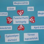 Az utolsó boldogságórát játékkal kezdtük (Kapu és kerítés), majd összegeztük a boldogságórák témáit. Ki kellett találniuk a diákoknak pár információ segítségével a kilenc témát, ezeket fel is ragasztották egy kartonra, ezt a főképünk. Majd röviden megbeszéltük ezeket, és végigkérdeztem, mit találtak a leghasznosabbnak.Három téma emelkedett ki: a boldogító jócselekedetek és a megbocsátás..