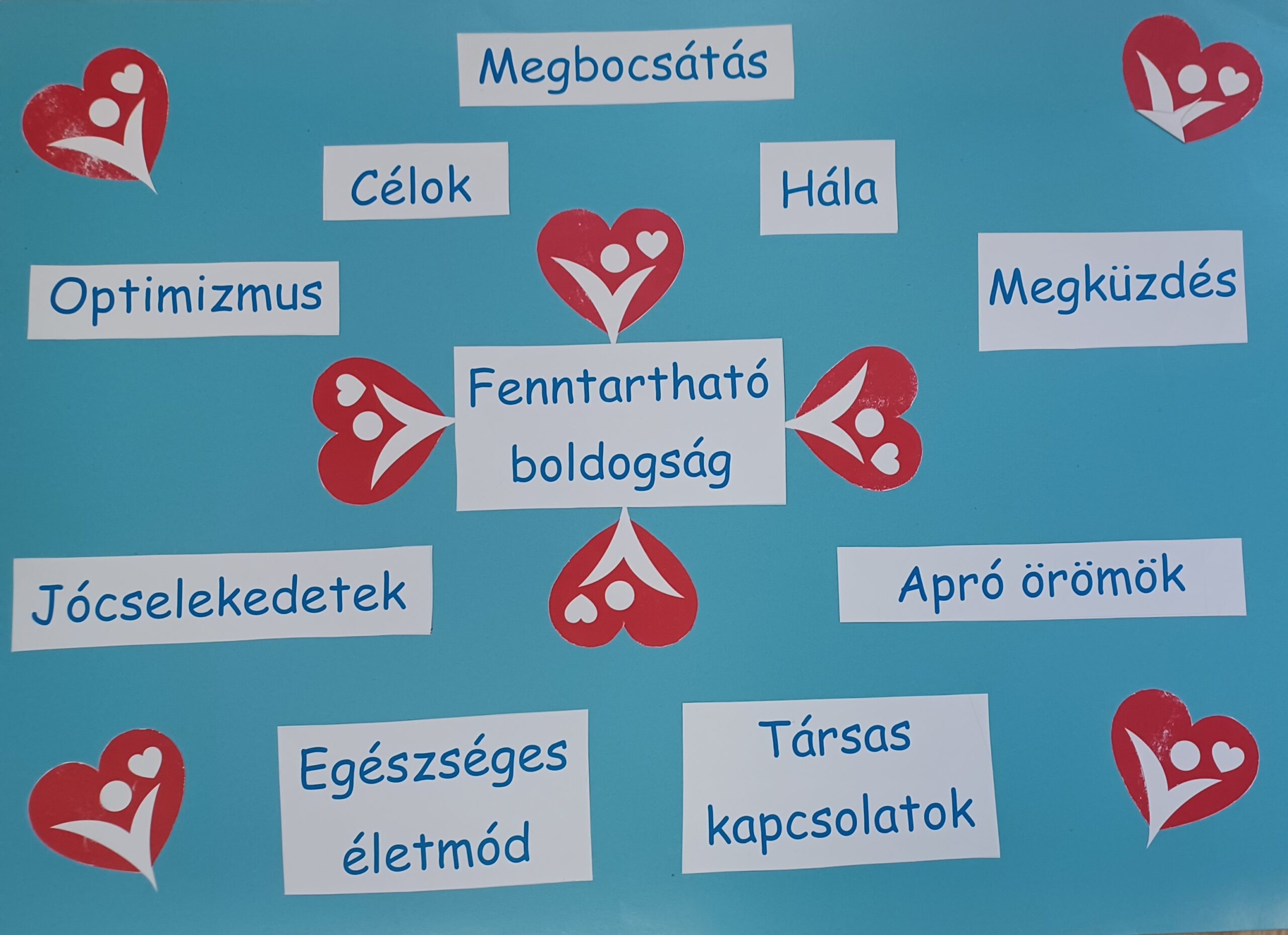 Az utolsó boldogságórát játékkal kezdtük (Kapu és kerítés), majd összegeztük a boldogságórák témáit. Ki kellett találniuk a diákoknak pár információ segítségével a kilenc témát, ezeket fel is ragasztották egy kartonra, ezt a főképünk. Majd röviden megbeszéltük ezeket, és végigkérdeztem, mit találtak a leghasznosabbnak.Három téma emelkedett ki: a boldogító jócselekedetek és a megbocsátás..