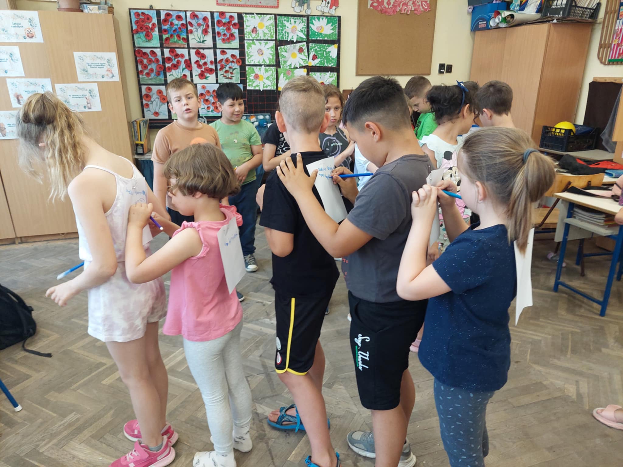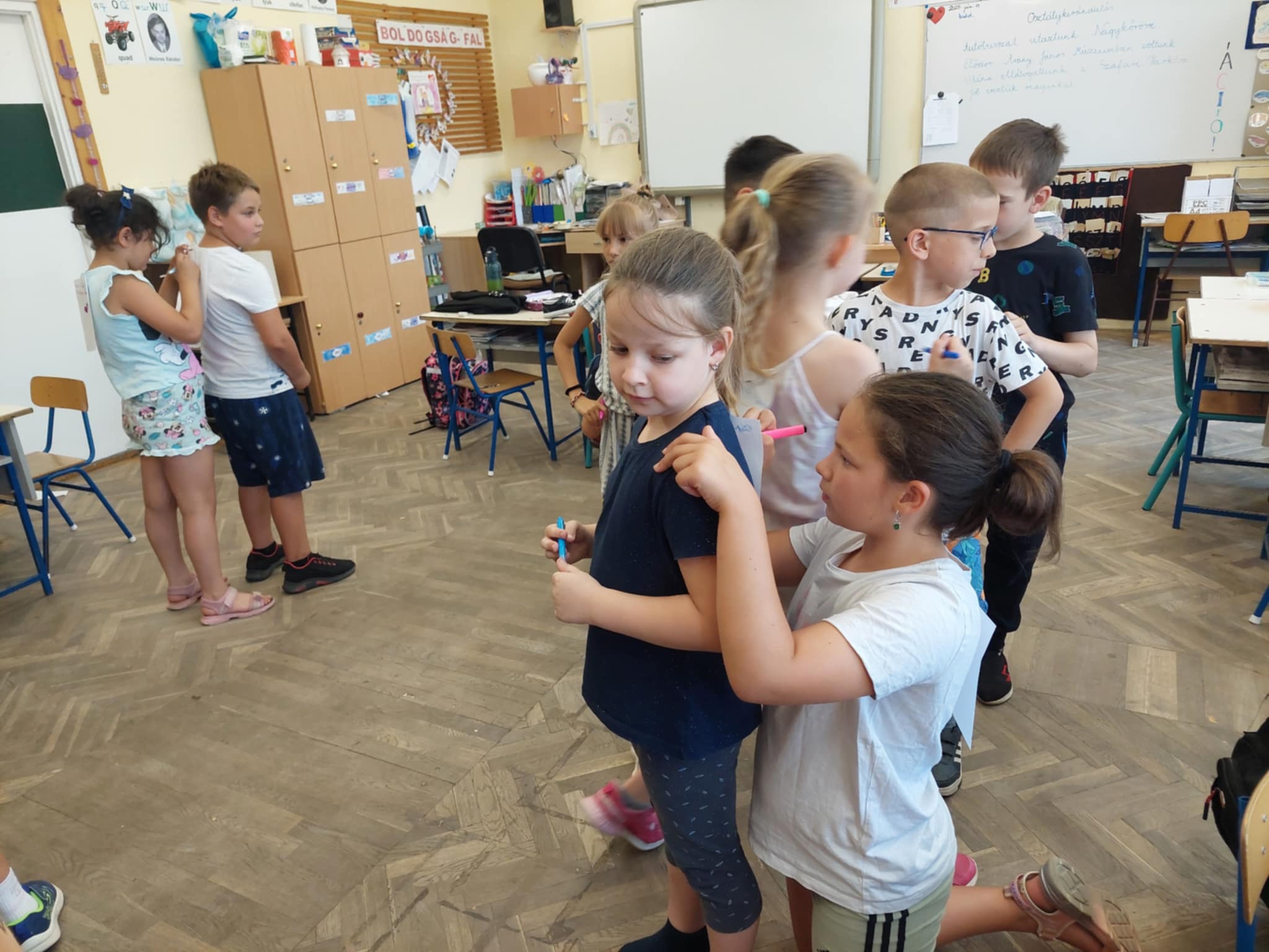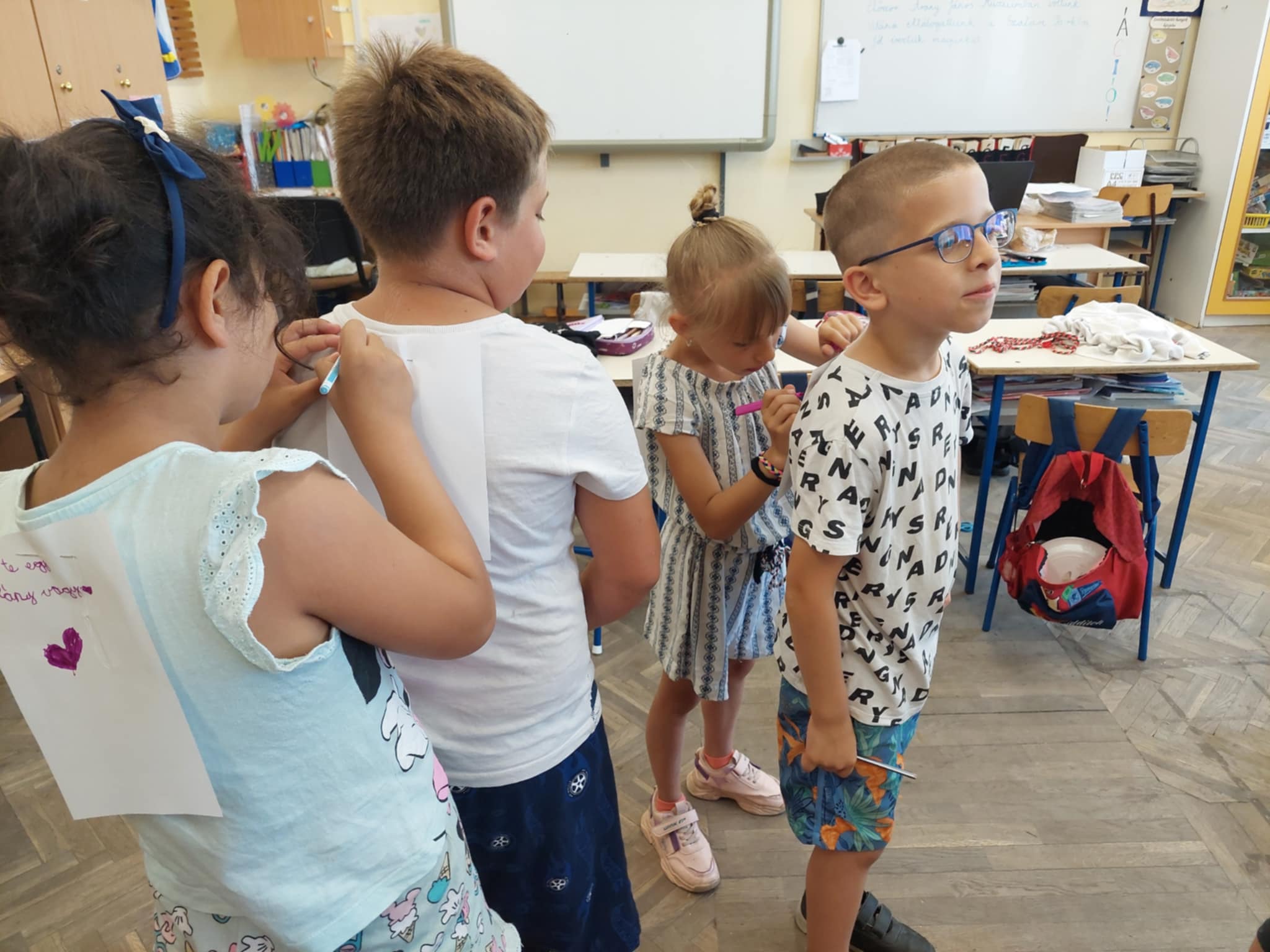 Egész tanévben számos alkalmat megragadva, természetesen a Boldogságórák mellett igyekeztünk szemléletüket formálni, türelmüket fejleszteni, egymás elfogadására megtanítani a gyerekeket. Az önbizalmuk erősítésére utolsó foglalkozásunkon a tanulók hátára tűzött papírra, azaz a képzeletbeli hátizsákjukba pozitív gondolatokat írtak fel társaik. A hátizsákra írt szavak, mondatok nagy örömöt okoztak.