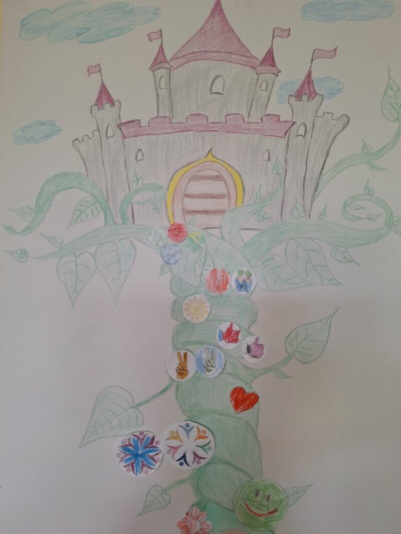 A boldogságlánc felragasztása a 10. lépcsőfokra. Ezzel fel is értünk a boldogságvárunkhoz.