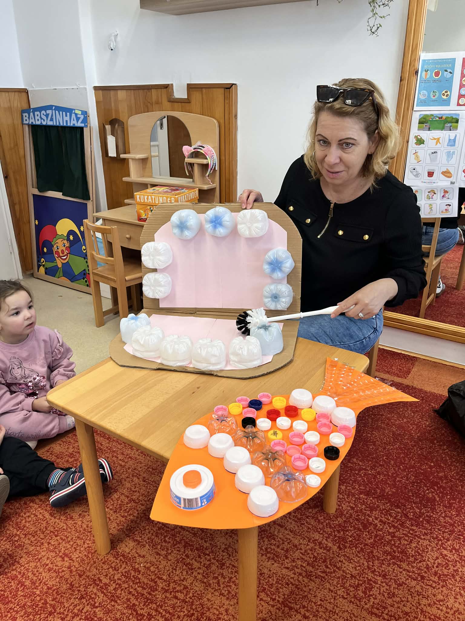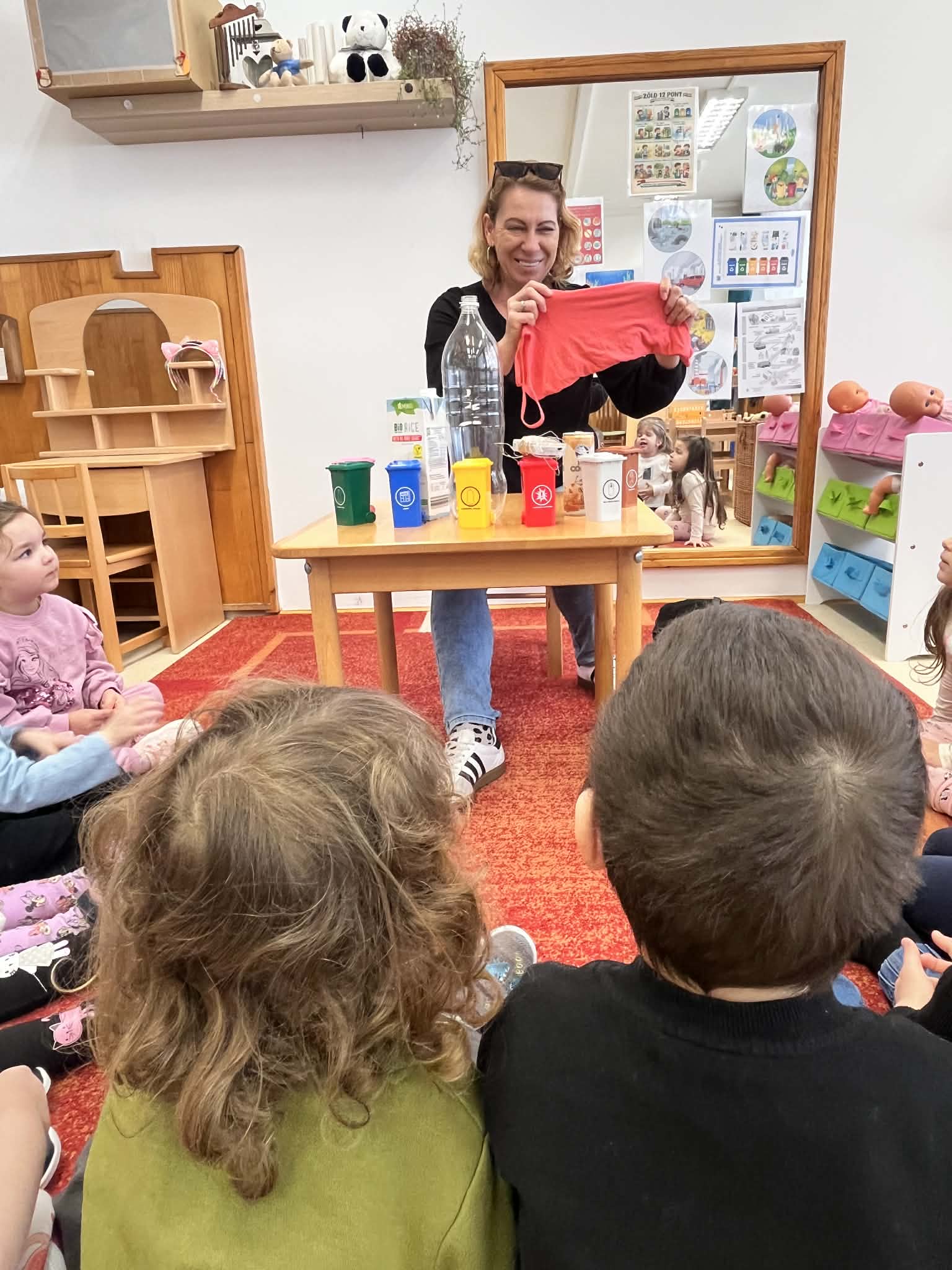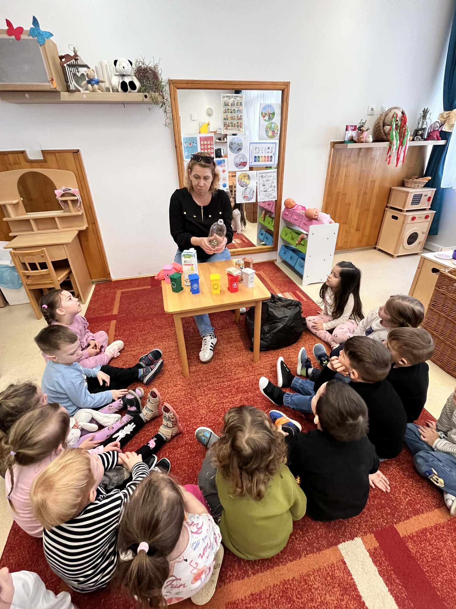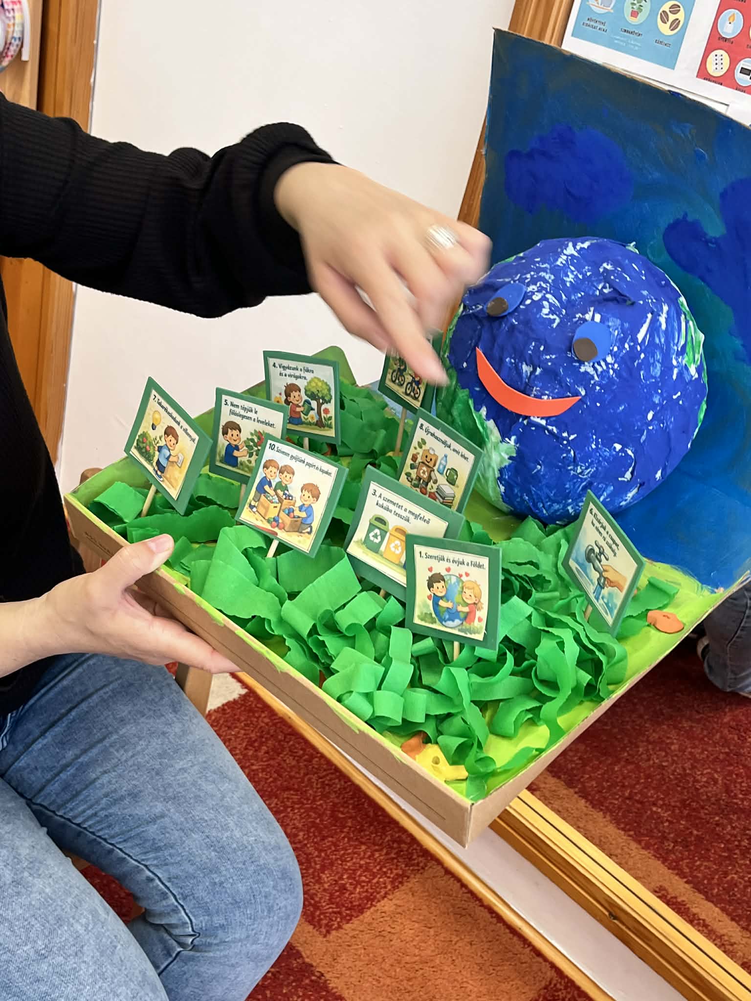 A Fenntartható boldogság témához kapcsolódva a gyermekekkel a szelektív hulladékgyűjtéssel, az újrahasznosítással és Földünk védelmével foglalkoztam. A tevékenységek során játékos formában ismertettem meg velük, hogyan lehet a különböző hulladékokat – például a papírt és a műanyagot – elkülönítve gyűjteni, és miért fontos vigyáznunk a környezetünkre. A beszélgetések és közös felfedezések során arra törekedtem, hogy a gyermekekben kialakuljon az a szemlélet, amelyben a természet védelme értékként jelenik meg.