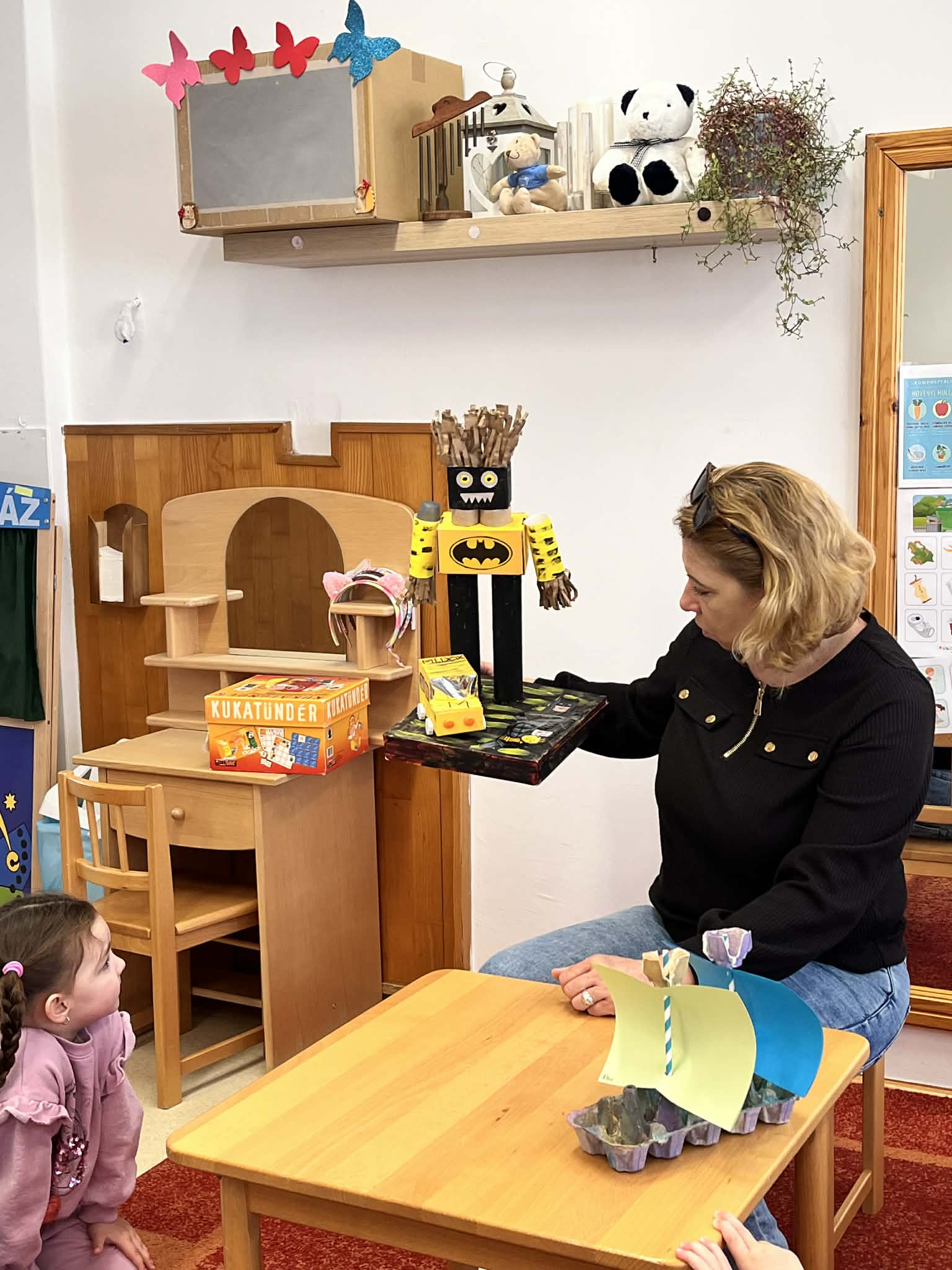 A gyermekekkel közösen készítettünk alkotásokat és játékokat újrahasznosítható anyagokból. Nagy örömmel tapasztaltam, hogy a gyerekek mennyire lelkesek voltak, amikor egy-egy hétköznapi tárgyból új játék vagy alkotás született. Ezek a közös alkotó pillanatok vidám hangulatot teremtettek, és erősítették a gyermekekben a sikerélményt és az összetartozás érzését.