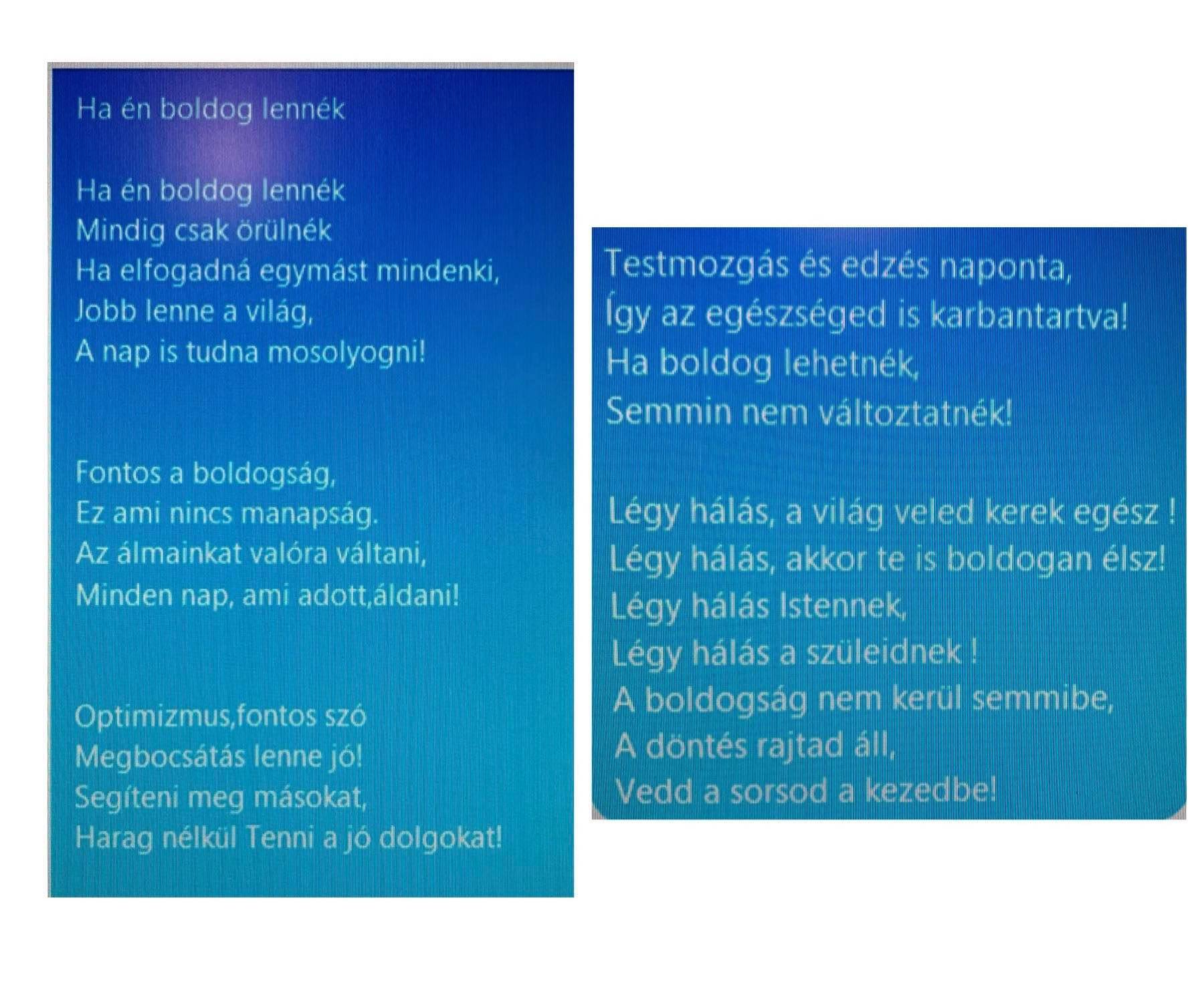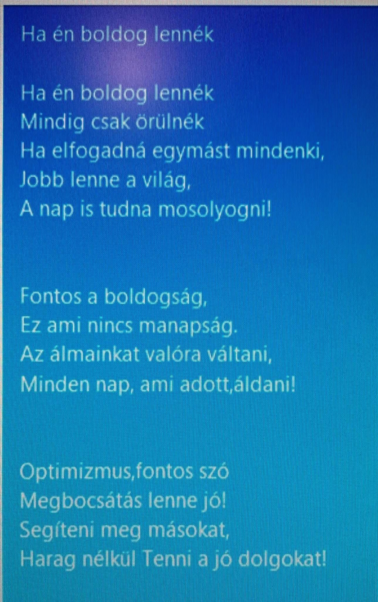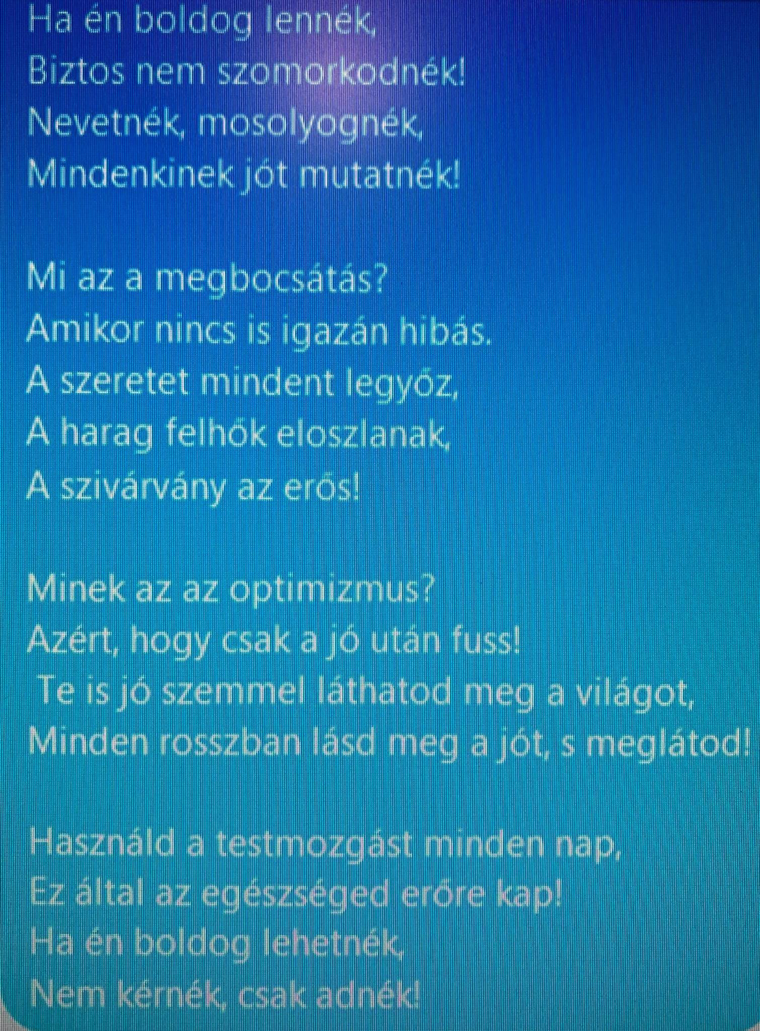 Sokat beszélgettünk a hetedikesekkel is, a nyolcadikosokkal is, mitől boldogok, vagy mi hiányzik ahhoz esetleg, hogy boldogak lehessenek! Ez már egy olyan korcsoport, akik teljesen tudják mi a valós helyzet, kendőzetlenül felfogják, hogy valami vagy fehér, vagy fekete, nehéz a köztes állapotot megtalálni annak, aki nem optimista, nem megbocsájtó. Egy ilyen korú gyereknek nem is kérdés a testmozgás, a fiúk kedvence a foci, a lányoké pedig a tánc. Naponta űzik ezeket a sportokat, eredményesen is, hiszen nem egy versenyre is részt vettek már.