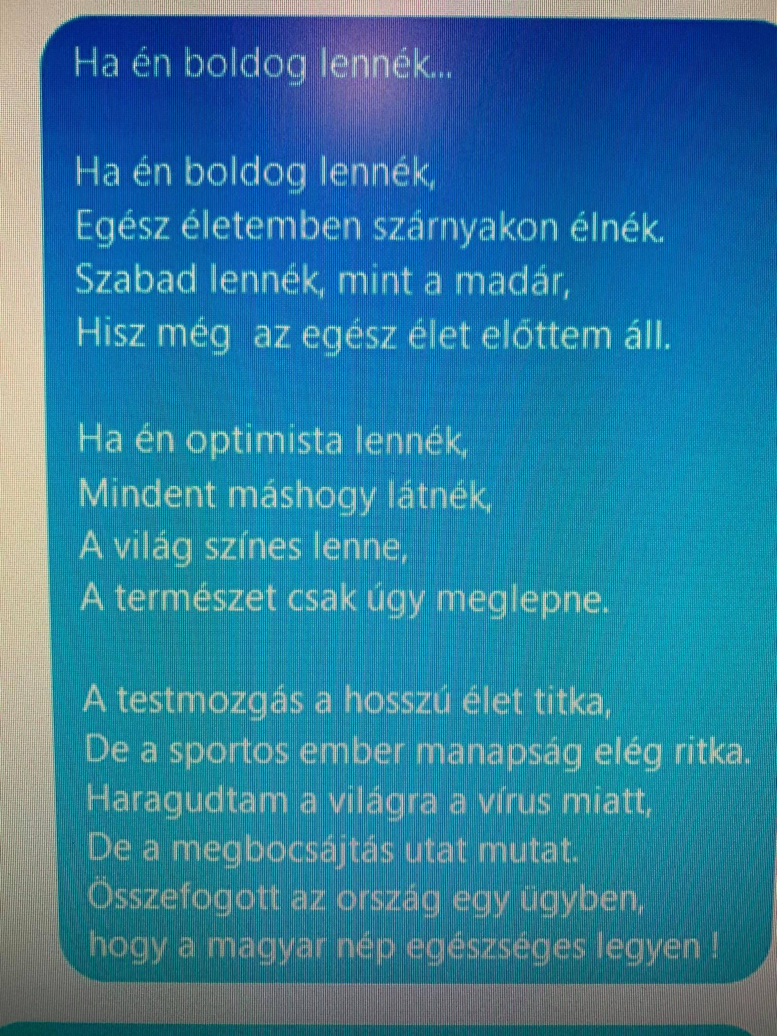 A hónap témája: A Fenntartható boldogság. Az én korcsoportom a 10 hónap során 7-8. osztályos tanulók voltak. A boldogság fenntartása a 8. osztályosaim számára külön nagyon fontos feladat! Eddig együtt voltunk, még ebben az online időszakban is, nap, mint nap. Most el kell engednem őket, nem tudunk beszélgetni, nem tudjuk a napjainkat átértékelni, videó telefonálni. De abban biztos vagyok, hogy az iskolánkban töltött időszakuk önmagában megerősítette őket, és erre még csak ” hab volt a tortán” a boldogságóra.