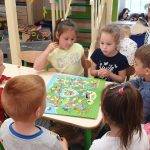 A foglalkozásokhoz a Napra forgó a napraforgó relaxációt választottam. Megtanítottuk a gyerekeknek Bagdi Bella: Jobb veled a világ c. dalát. A dalra mozdulatokat találtunk ki. Elmeséltem nekik a Boldog erdő c. mesét. A mese végén megbeszéltük a kérdéseket. Nagyon szerették a gyerekek a seprűs táncot. Főleg azért, mert nem kiesős játék, hanem akinél a seprű maradt, az a társa mögé csatlakozott. Napi szinten játszottuk a boldogságóra társasjátékot, a Pozitivityt. A gyerekek nagyon szerették, mindig kérték, hogy játsszunk vele. A homokozóban a gyerekekkel megépítettük a boldogságvárat. A 9 hónap jelét kinyomtattuk, lelamináltuk, zászlókat készítettünk belőle és az elkészült várra tűztük ki.