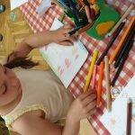 A foglalkozásokhoz a Napra forgó a napraforgó relaxációt választottam. Megtanítottuk a gyerekeknek Bagdi Bella: Jobb veled a világ c. dalát. A dalra mozdulatokat találtunk ki. Elmeséltem nekik a Boldog erdő c. mesét. A mese végén megbeszéltük a kérdéseket. Nagyon szerették a gyerekek a seprűs táncot. Főleg azért, mert nem kiesős játék, hanem akinél a seprű maradt, az a társa mögé csatlakozott. Napi szinten játszottuk a boldogságóra társasjátékot, a Pozitivityt. A gyerekek nagyon szerették, mindig kérték, hogy játsszunk vele. A homokozóban a gyerekekkel megépítettük a boldogságvárat. A 9 hónap jelét kinyomtattuk, lelamináltuk, zászlókat készítettünk belőle és az elkészült várra tűztük ki.