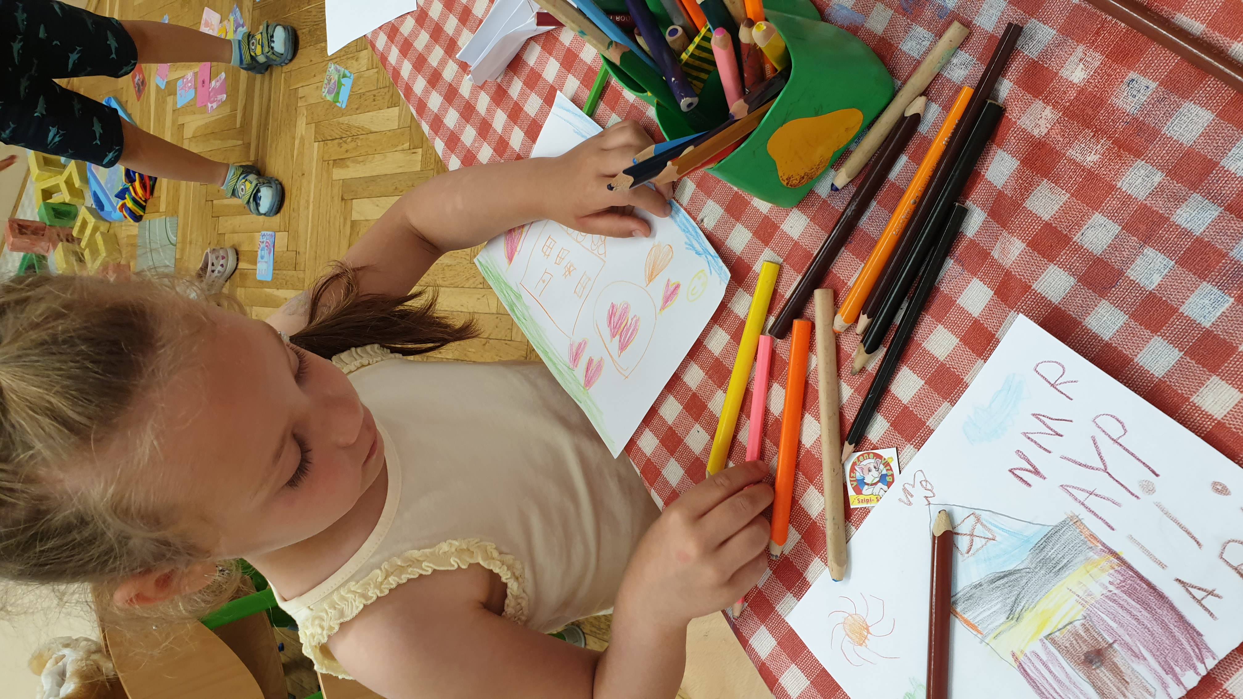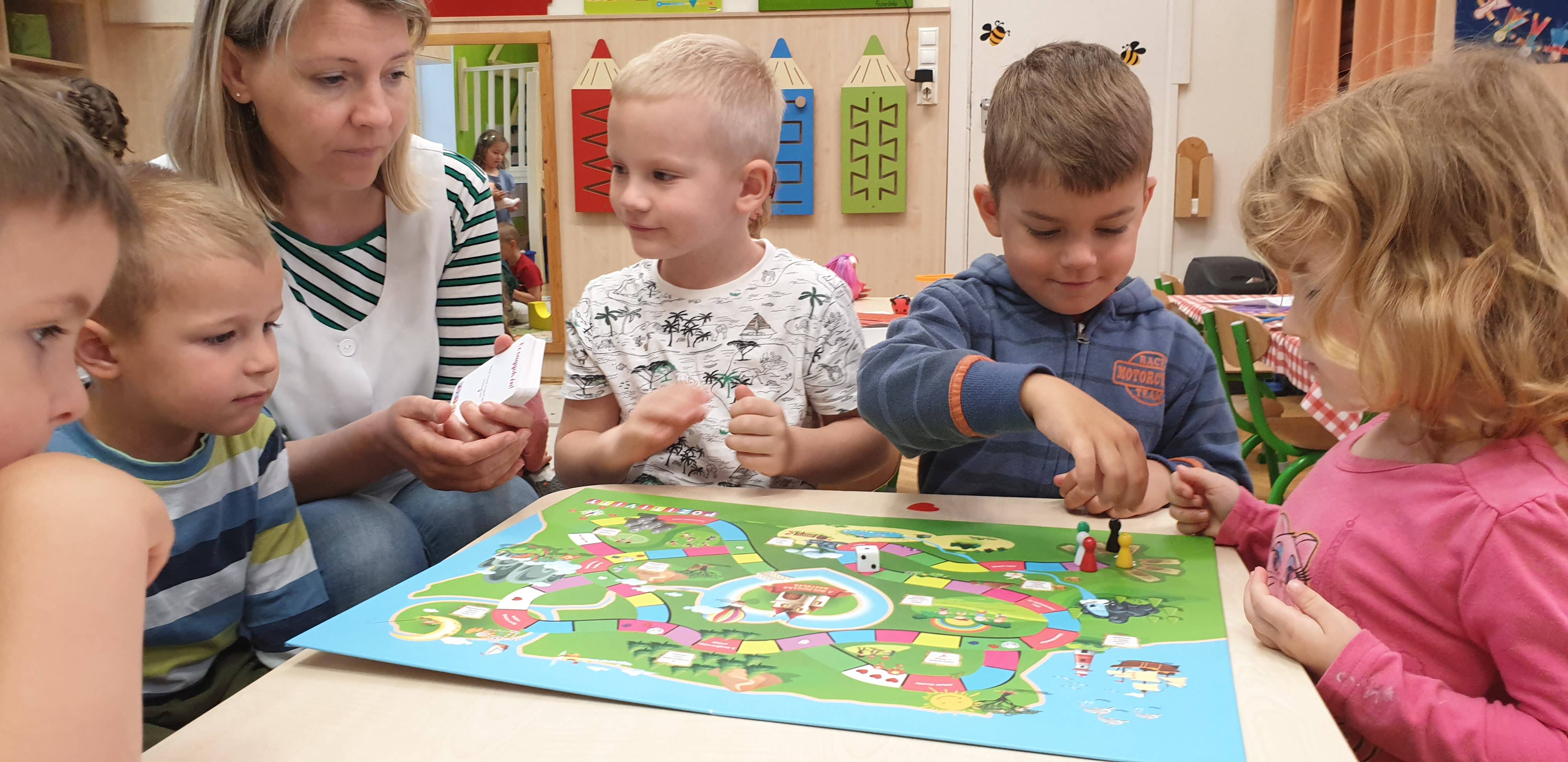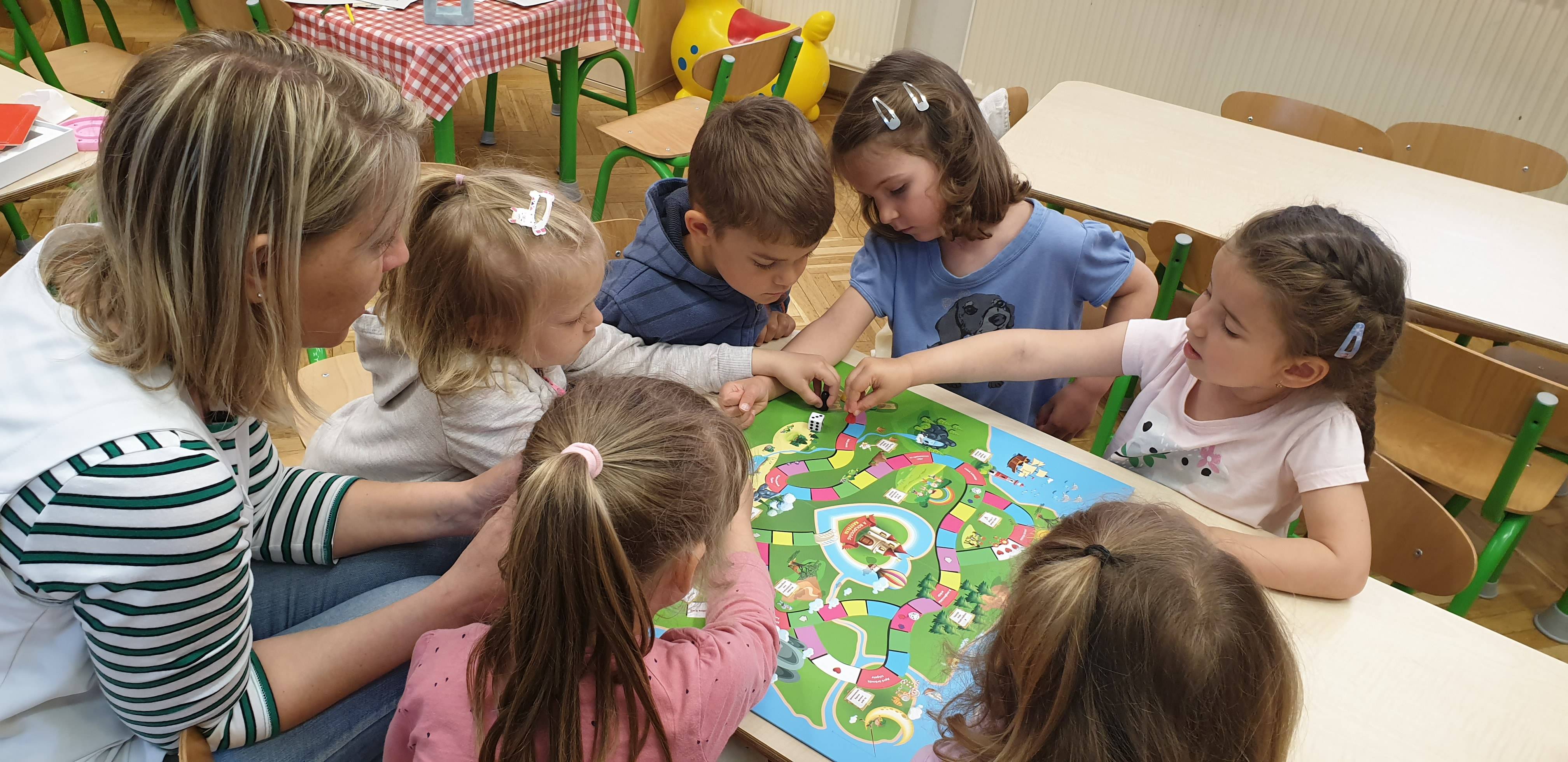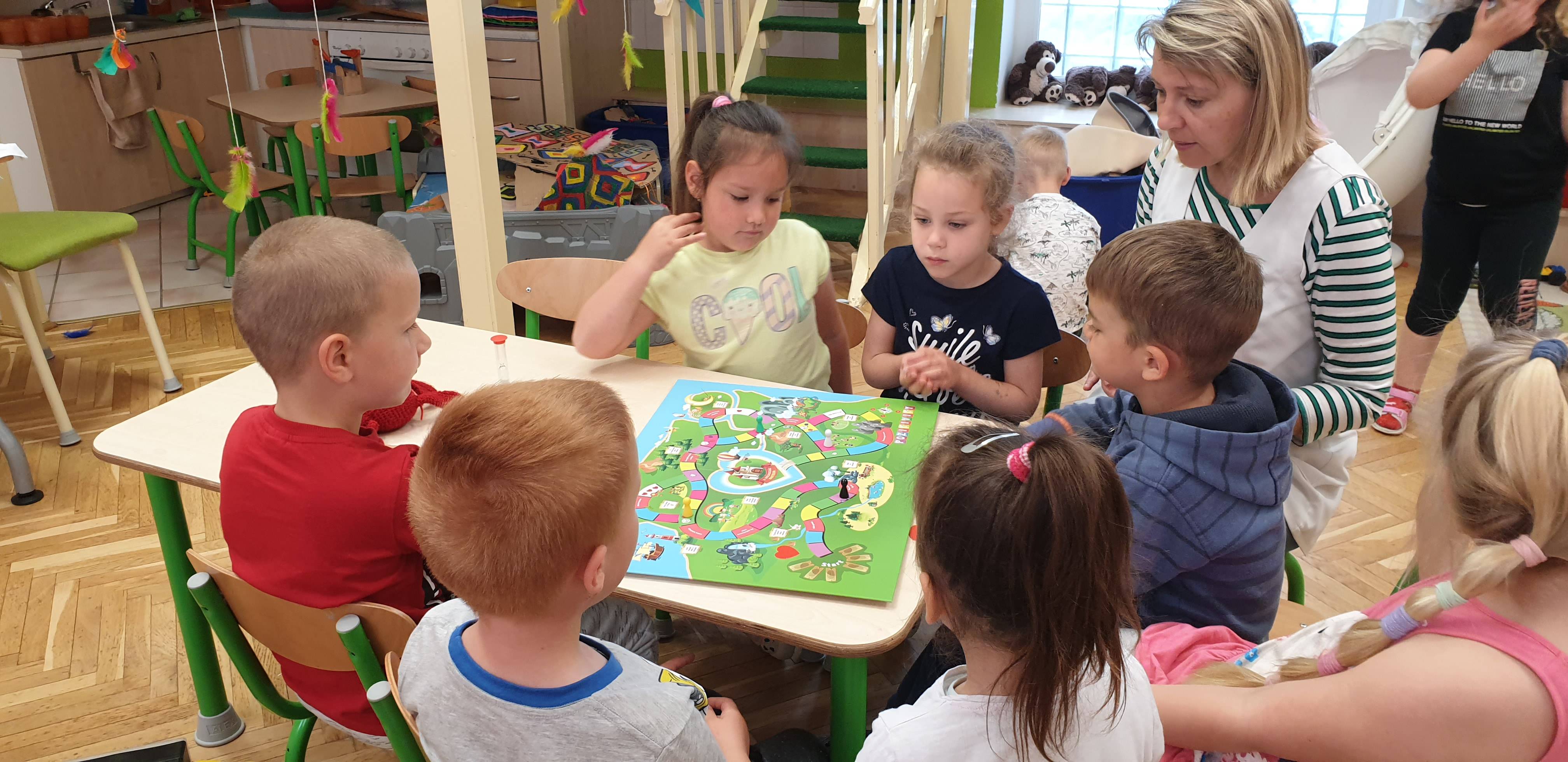 A foglalkozásokhoz a Napra forgó a napraforgó relaxációt választottam. Megtanítottuk a gyerekeknek Bagdi Bella: Jobb veled a világ c. dalát. A dalra mozdulatokat találtunk ki. Elmeséltem nekik a Boldog erdő c. mesét. A mese végén megbeszéltük a kérdéseket. Nagyon szerették a gyerekek a seprűs táncot. Főleg azért, mert nem kiesős játék, hanem akinél a seprű maradt, az a társa mögé csatlakozott. Napi szinten játszottuk a boldogságóra társasjátékot, a Pozitivityt. A gyerekek nagyon szerették, mindig kérték, hogy játsszunk vele. A homokozóban a gyerekekkel megépítettük a boldogságvárat. A 9 hónap jelét kinyomtattuk, lelamináltuk, zászlókat készítettünk belőle és az elkészült várra tűztük ki.