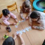 A foglalkozást az „Almát szedj, ügyesedj!” „A haragom kifújom, mint a cica nyújtózom”, „Domborítok, mint a cica, házba bújok, mint a csiga” relaxációs gyakorlattal indítottuk. A Bagdi Bella: „Ha boldog vagy…” dalával pozitív energiákat szabadítottunk fel, a gyermekek lelkesen, önfeledten táncoltak, mozogtak a zenére, majd a „Kis barátom, hogy vagy?” játékkal folytattuk a foglalkozást. Ezután készítettünk barátság karkötőt, amit az érzelmileg, hozzájuk legközelebb álló gyermeknek ajándékozhattak. A mezítlábas ösvényen egymást kellett vezetni, így lehetőség nyílt a baráti kapcsolatok, a bizalom alakítására, erősítésére. A foglalkozások alkalmával játszottunk „Szomorú Szilárd, és Boldog Blanka” szituációs játékot is, amit a gyermekek nagyon élveztek. Készítettünk „Bartság-ujjlenyomatok” táblát is, amelyre a gyermekek egymás ujjlenyomataiból különböző ábrákat készítettek. A csoportunk összetételét illetően, a gyermekek sajátos nevelési igényű, tanulásban akadályozott gyermekek, ezért a feladatok elvégzésében, az érzelmek kifejezésében, megfogalmazásában sok segítséget igényeltek, igényelnek.